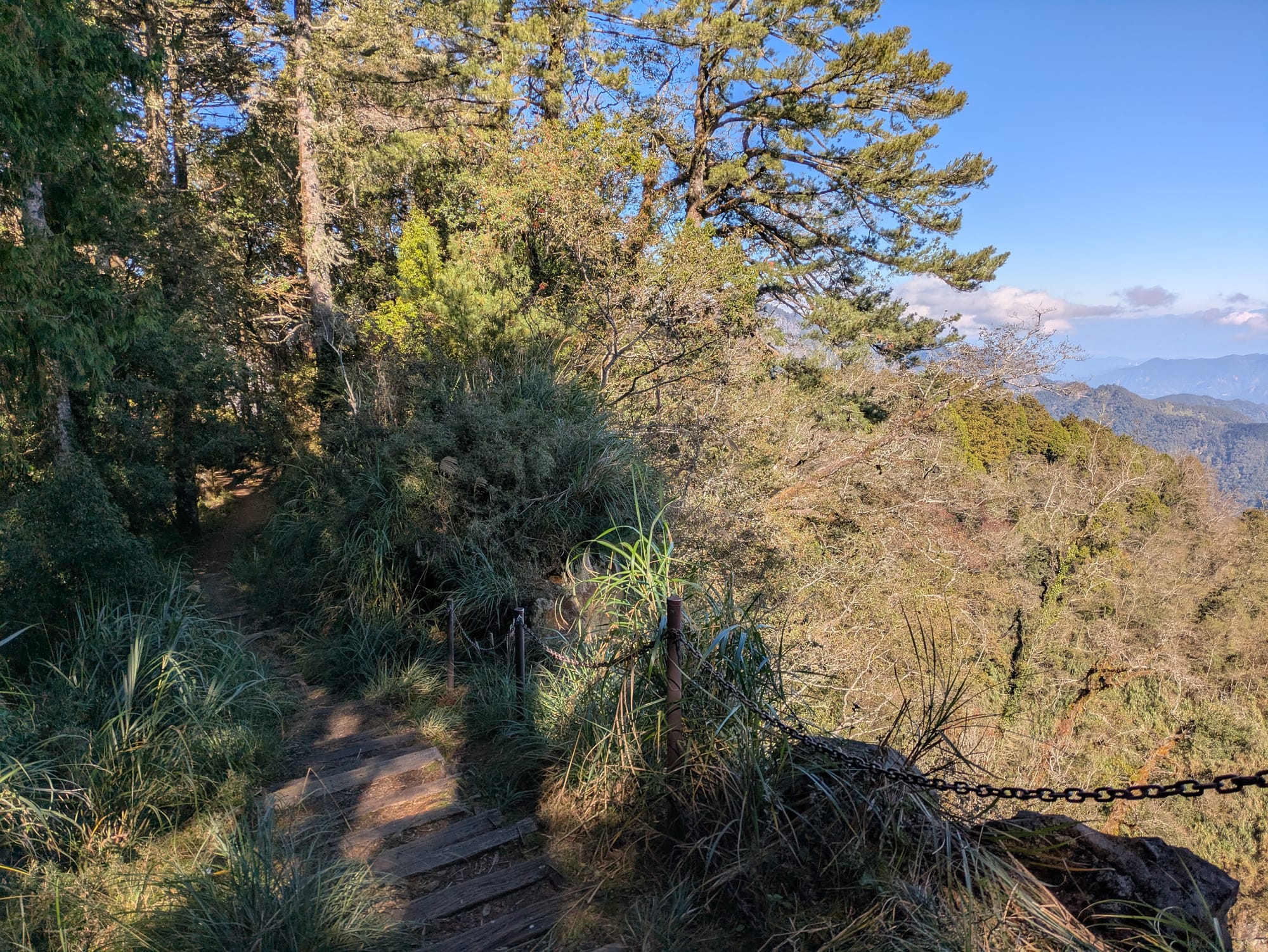 Most of the trails went through the forest but dotted throughout Alishan are a number of viewing platforms, usually at the top of of a peak or ridge, where I could get a look at the mountain scenery. But the view pictured above I saw not at a platform but just on the side of one of the less popular trails. The path goes up a ridge and at one point there is a cliff on the side preventing trees from growing, thus providing a clearing for the view. From there I could see the valley and mountains stretching far into the distance.
