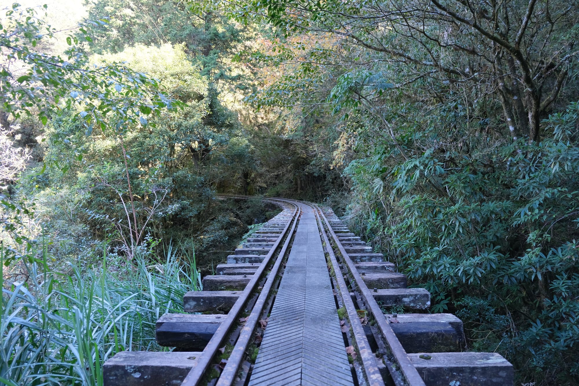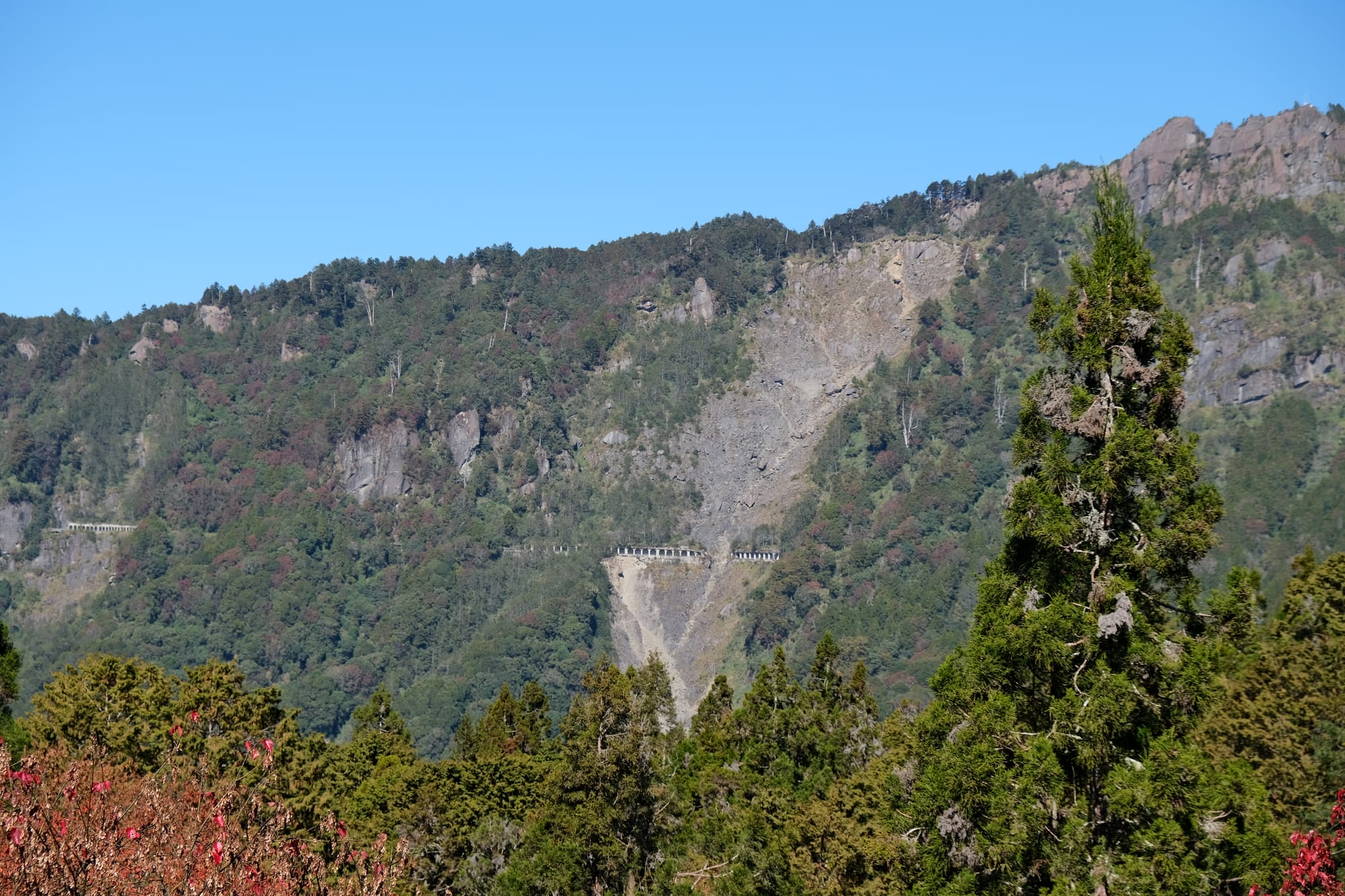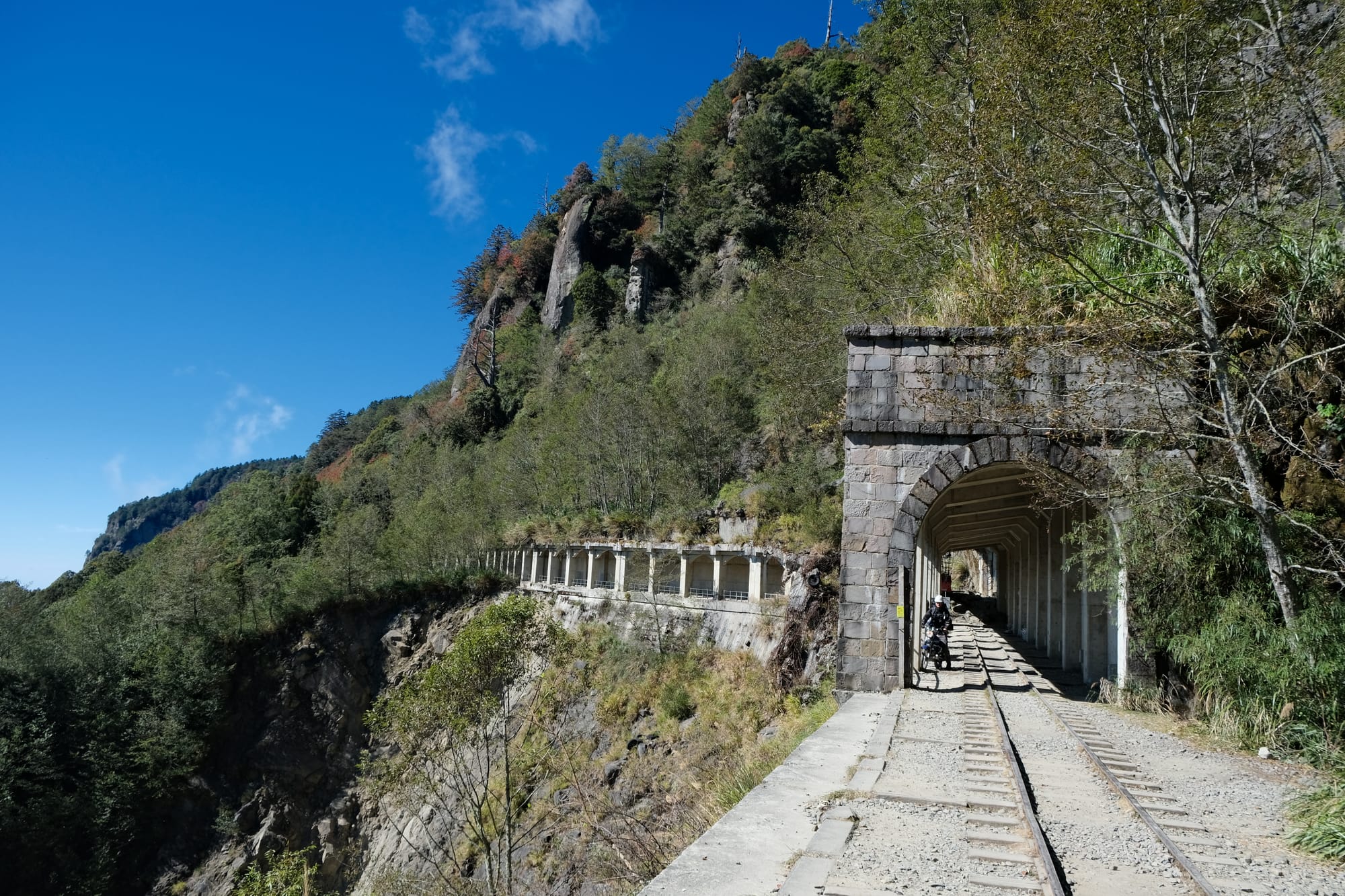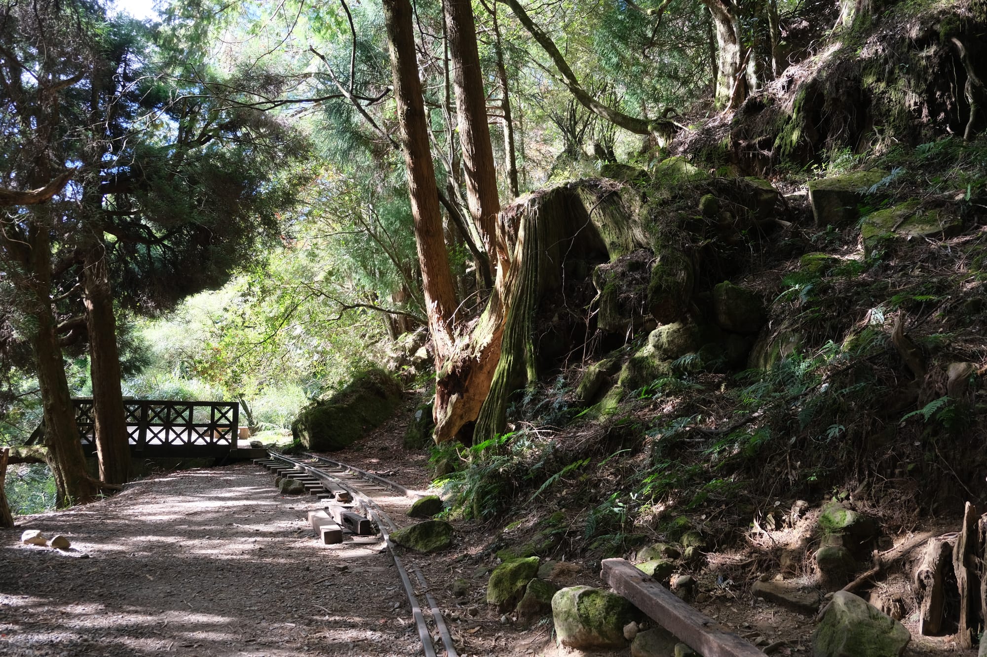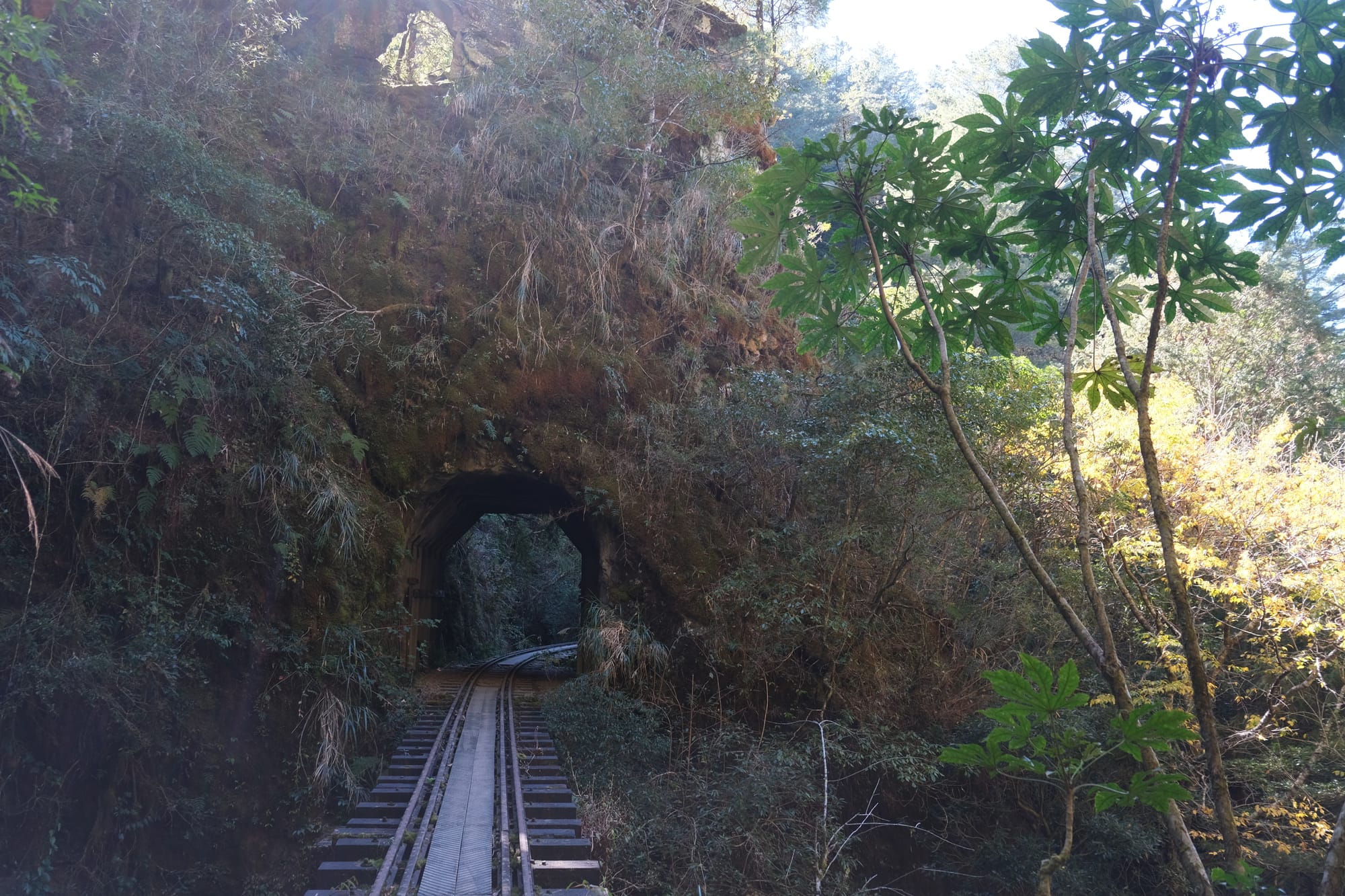 The hike is nine kilometers long one way and follows the Mianyue railway line. This railway line used to be operational but ten years ago a section of the slope collapsed during a typhoon, sweeping away part of the track. There was also a tunnel where part of the roof had collapsed during an earthquake. The above image is taken from an observation deck in Alishan showing the Mianyue railway line in the middle of the mountain slope, including the section that is broken. Since the line is closed to regular train service it has become a famous hike as the mountain area the railway line goes through is very beautiful.