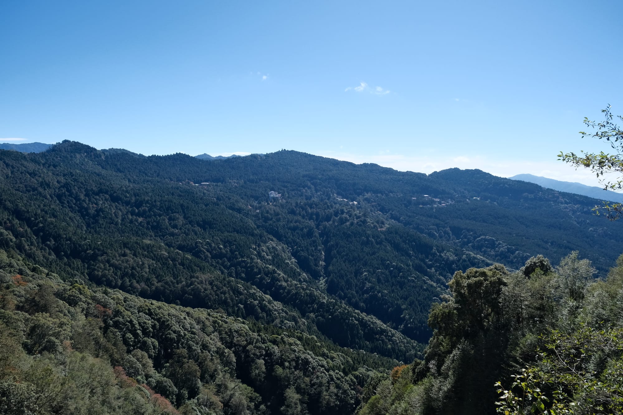 Most of the trails went through the forest but dotted throughout Alishan are a number of viewing platforms, usually at the top of of a peak or ridge, where I could get a look at the mountain scenery. But the view pictured above I saw not at a platform but just on the side of one of the less popular trails. The path goes up a ridge and at one point there is a cliff on the side preventing trees from growing, thus providing a clearing for the view. From there I could see the valley and mountains stretching far into the distance.