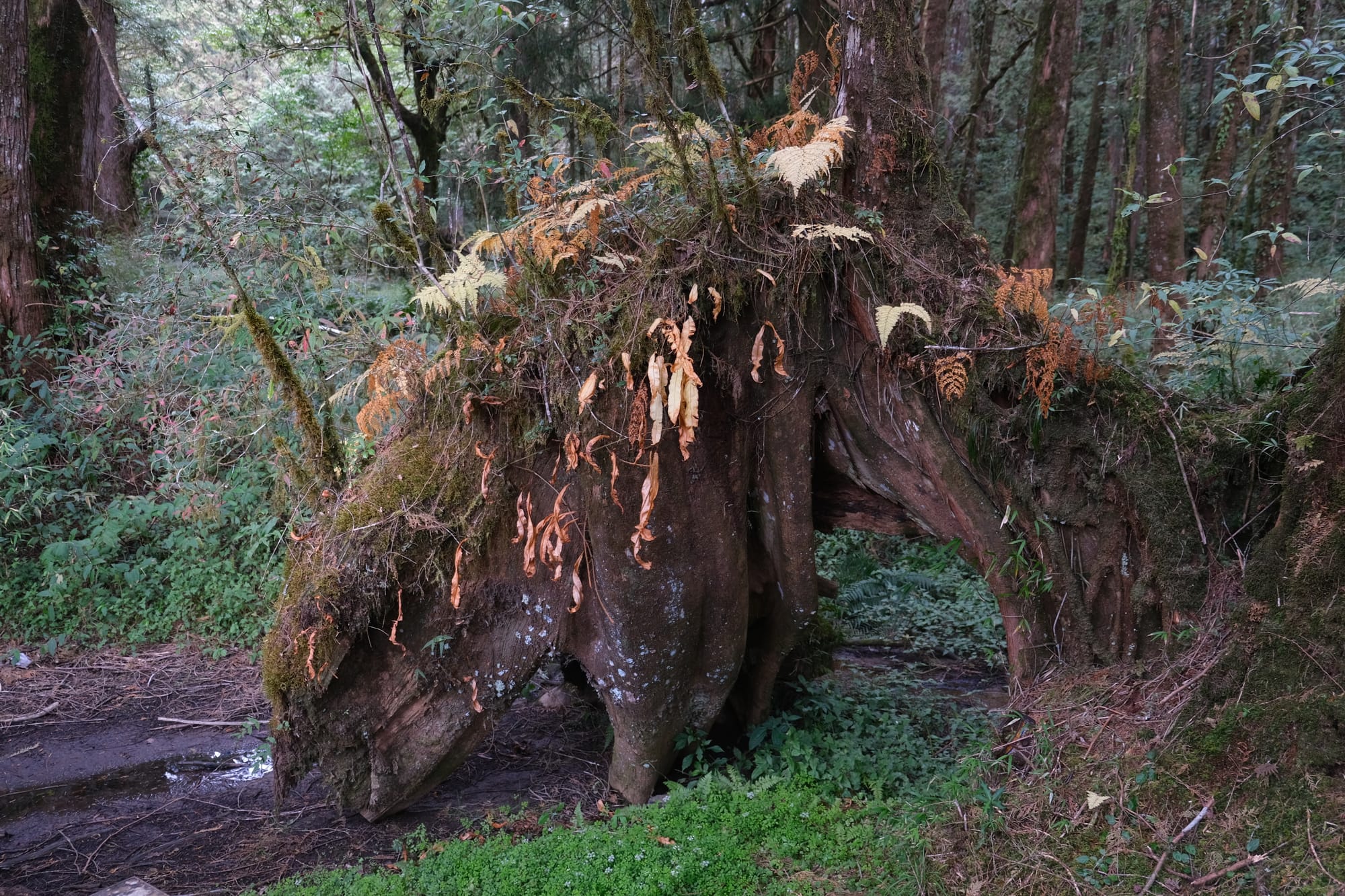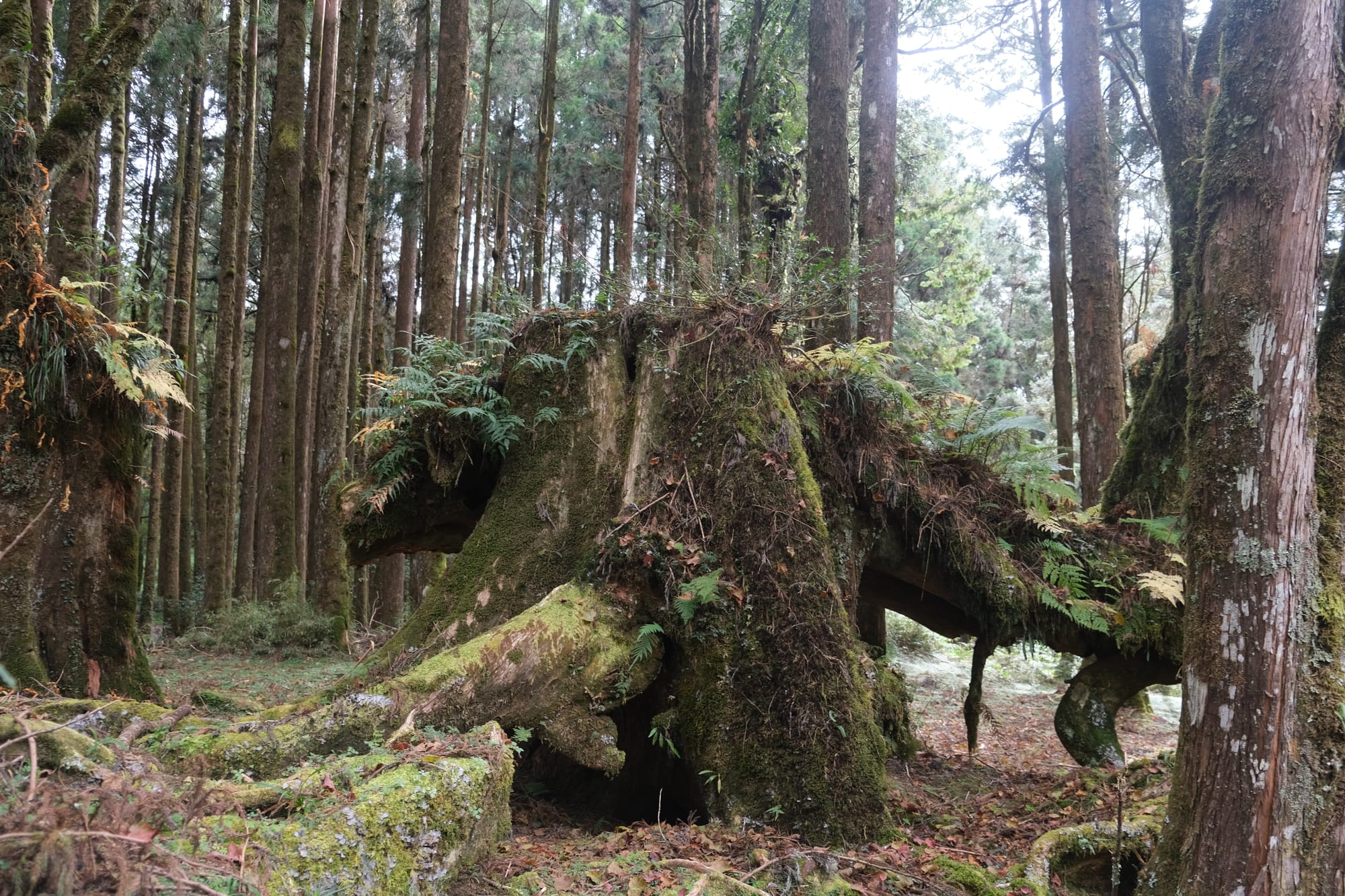 There are many giant stumps in the forest, some of these are the remains of ancient cypress trees that were harvested by the Japanese, but others are older still. Because the wood is so strong these stumps do not decay away easily and they remain in place, still firmly holding the soil on the mountain with their long dead roots.