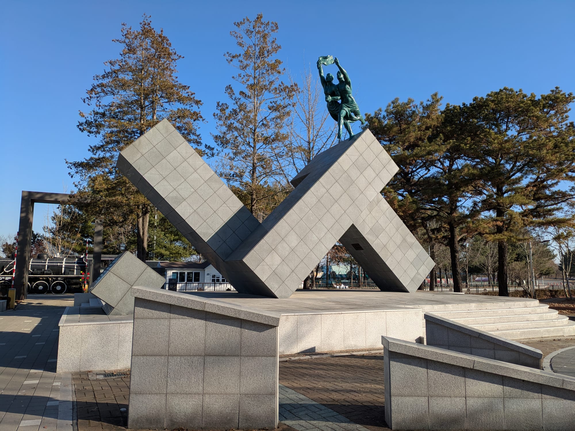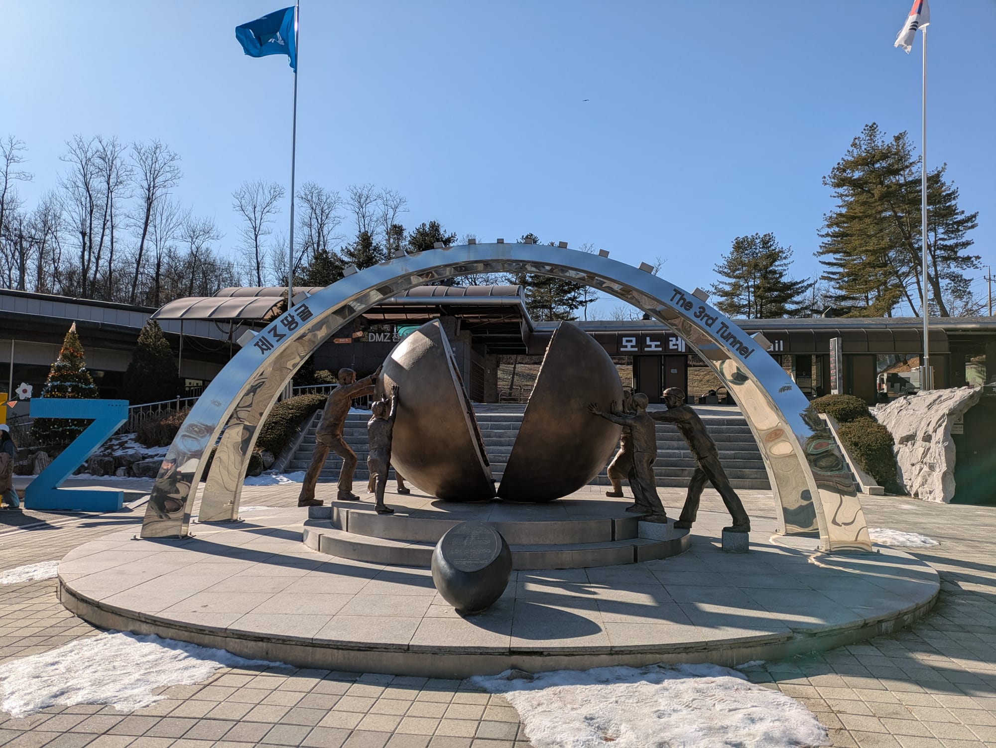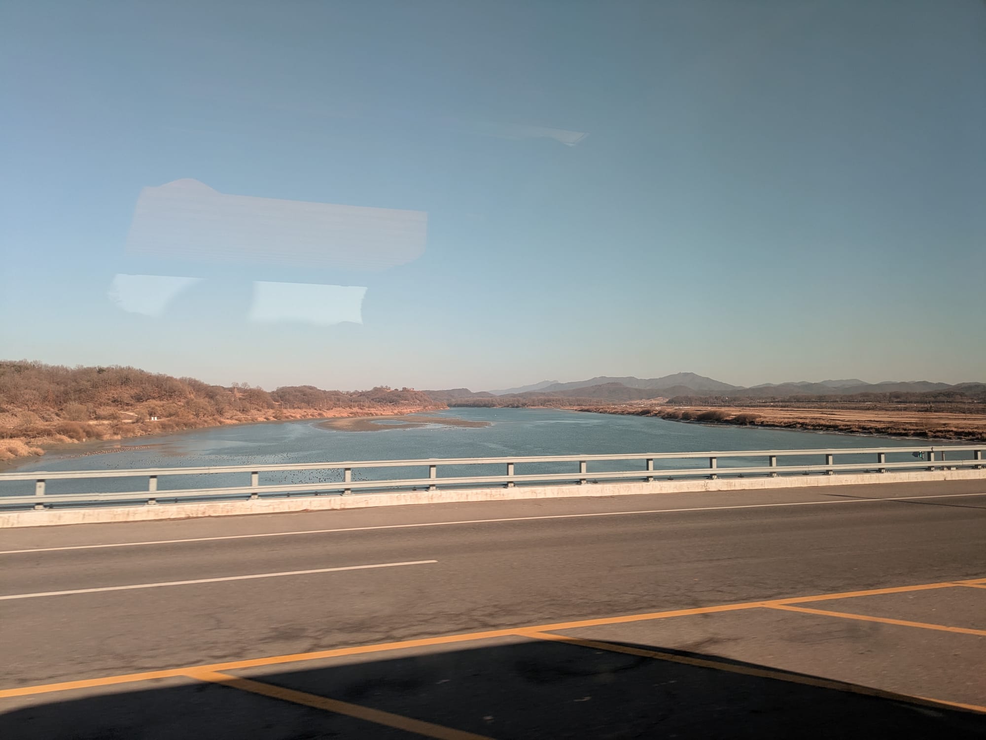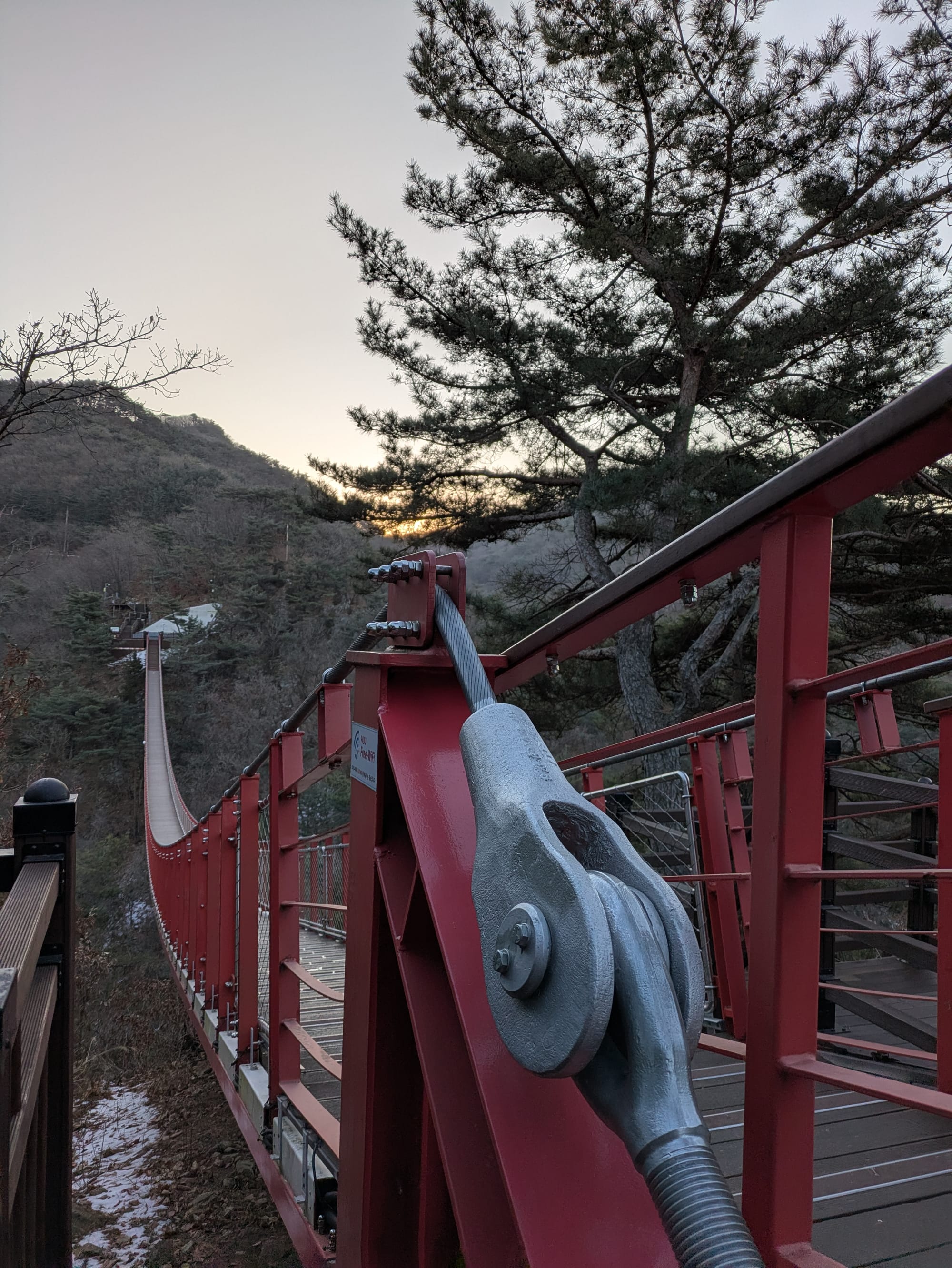 On the last day of 2024 we joined a tour of the DMZ between south and north Korea. We were part of a large group on a bus that could fit up to 50 people, and because of the military schedules, we had to leave Seoul at 6:40 AM. Our tour guide was Lina, she was an excellent guide, a local who could provide not only the history of the demilitarized zone but share her own experiences with it. Our tour included five main stops, these were: the red suspension bridge, the peace park, the third tunnel, the Dora Observatory, and finally a stop at a market/buffet restaurant where we ate a late lunch.