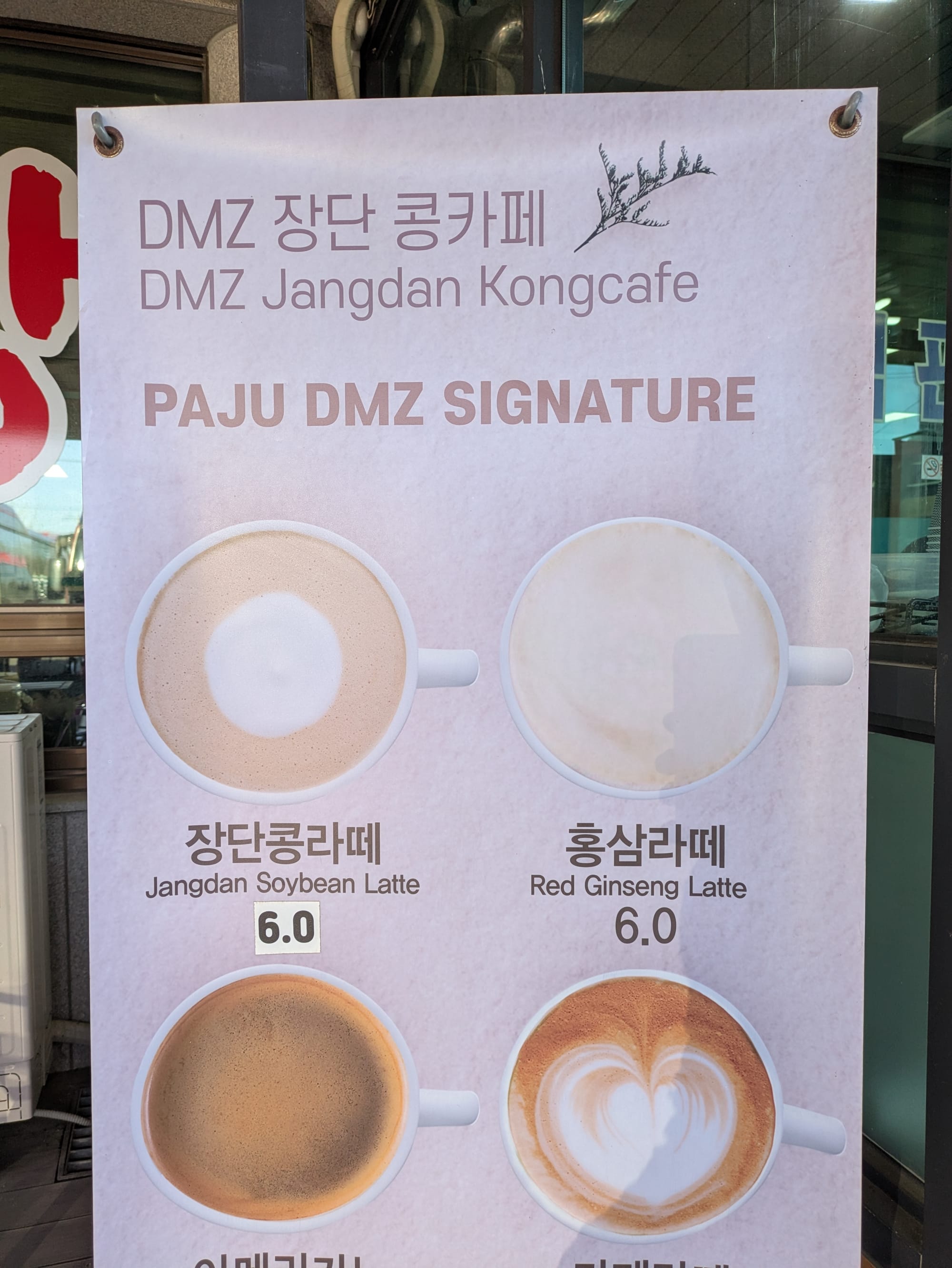 There was this large building with a buffet restaurant and a souvenir/produce store. There wasn't any time to explore the village (and I suspect we would not have been allowed). I had a look through the shop where I bought some local soybean chocolate shaped like a grenade. All the products were branded with the DMZ and marketed to tourists. I then went to the buffet and ate a little rice, I was still feeling a bit unwell so didn't eat much. Outside the building there was a little cafe store selling a Jangdan soybean latte, it was perhaps the best soy latte I have ever tried.