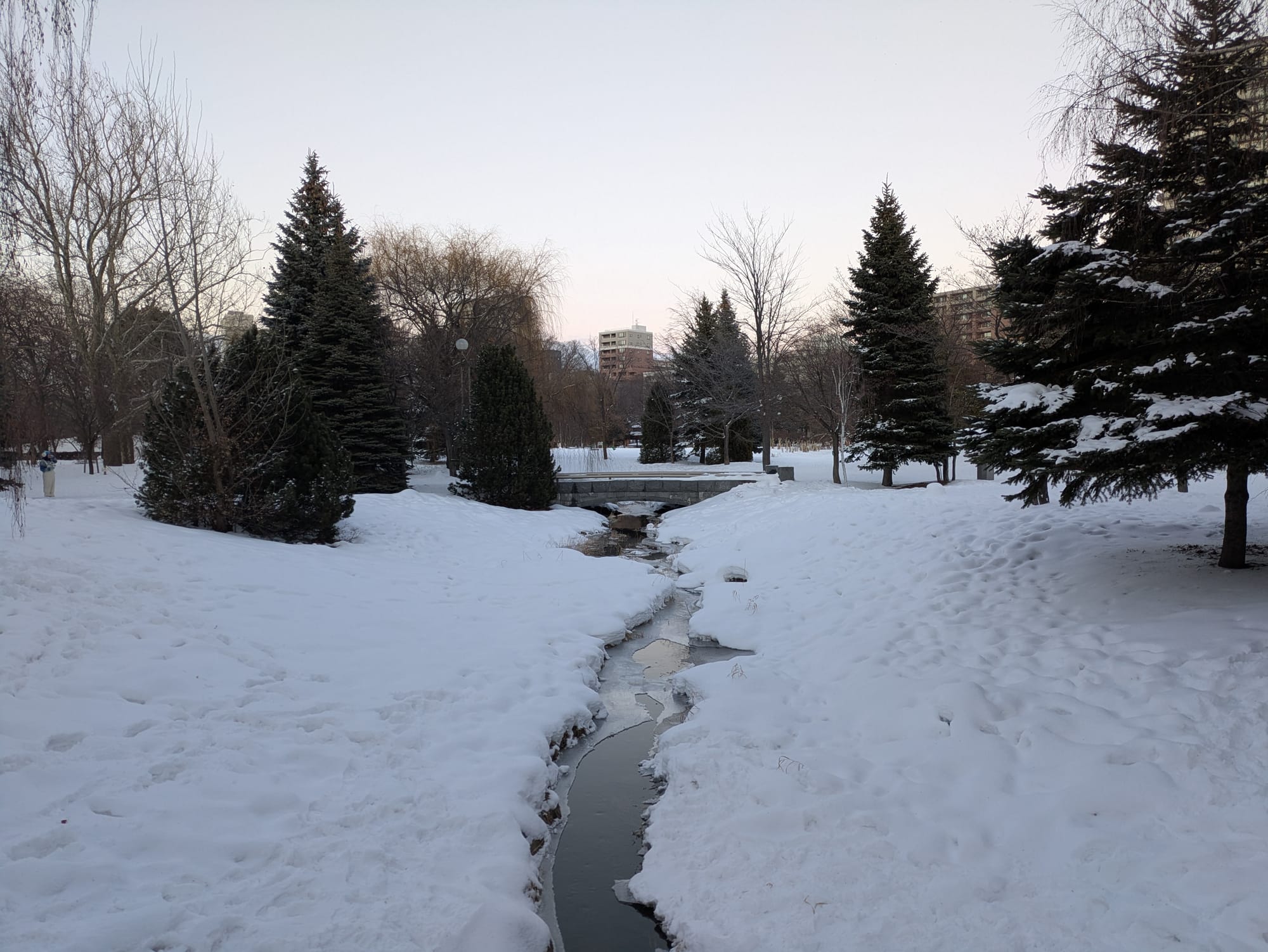 The trail followed this river upstream; the scenery all around was covered in white snow.