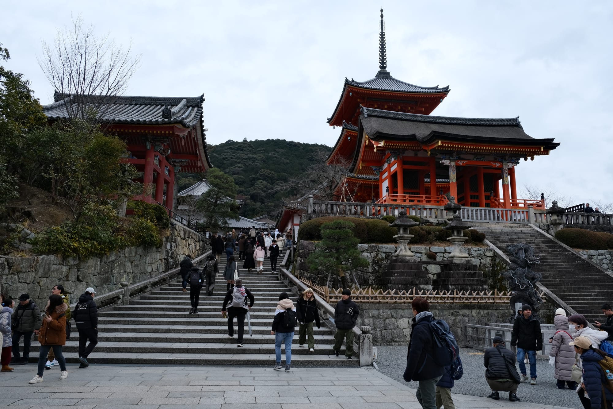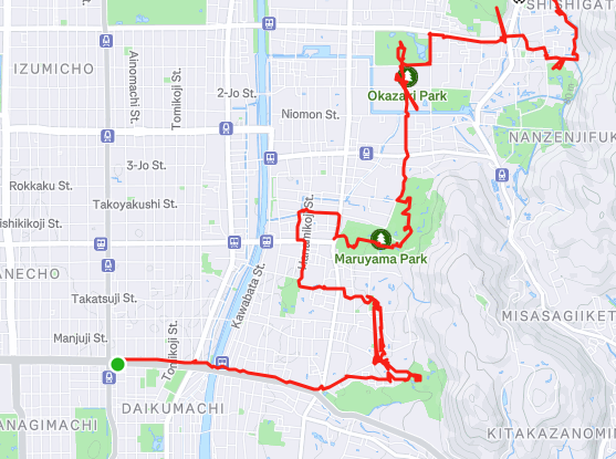 My plan was to start from the Kiyomizu-dera Niomon Gate (the place where the walking tour had ended) and then walk north through many of the historic districts and temples of Kyoto, ending at mount Daimonjiyama. To get to Kiyomizu-dera temple from my hotel there weren't any good transit options, so I just walked the two kilometers instead. On the way I saw more of the central, modern, part of Kyoto (where my hotel was located) and I crossed the river.
