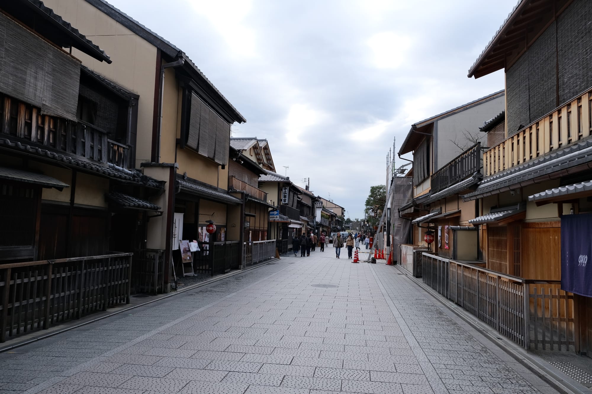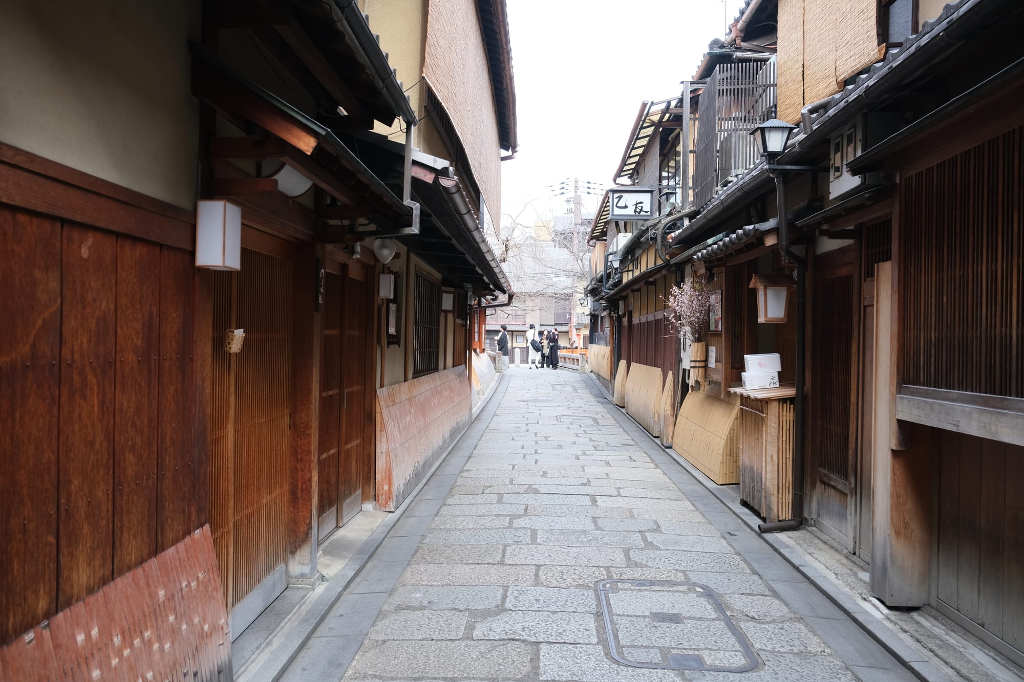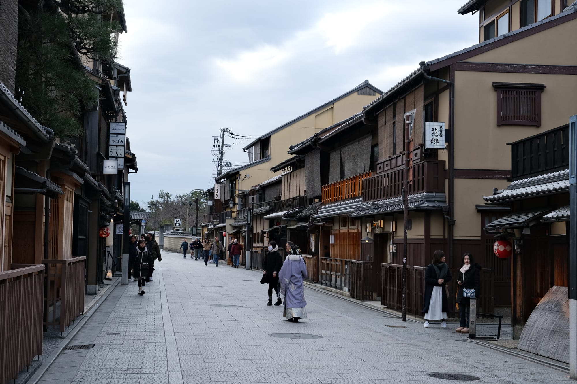 Another beautiful Kyoto street, Hanamikoji-dori, with many wooden buildings in the traditional style.