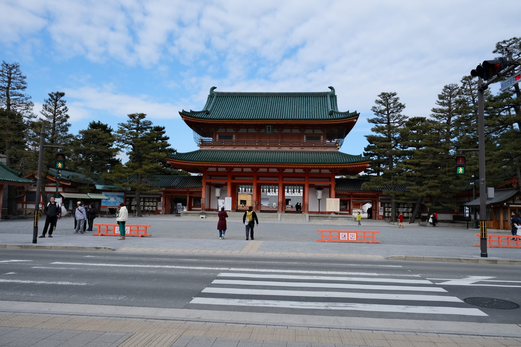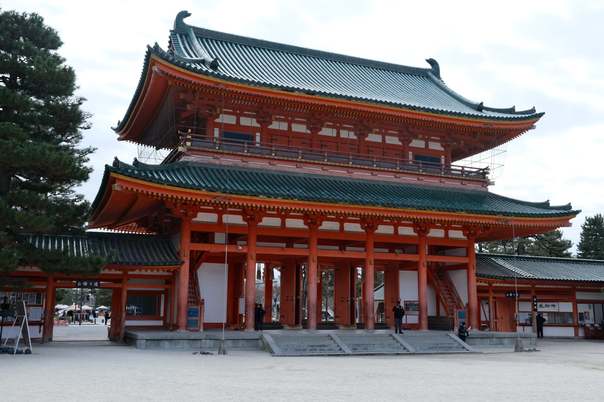 I had a quick look in the Heian Jingu Shrine. The entrance is this large red and white gate with green roof tiles. The inside had a large courtyard surrounded by a wall. The main building of the shrine was under repairs.