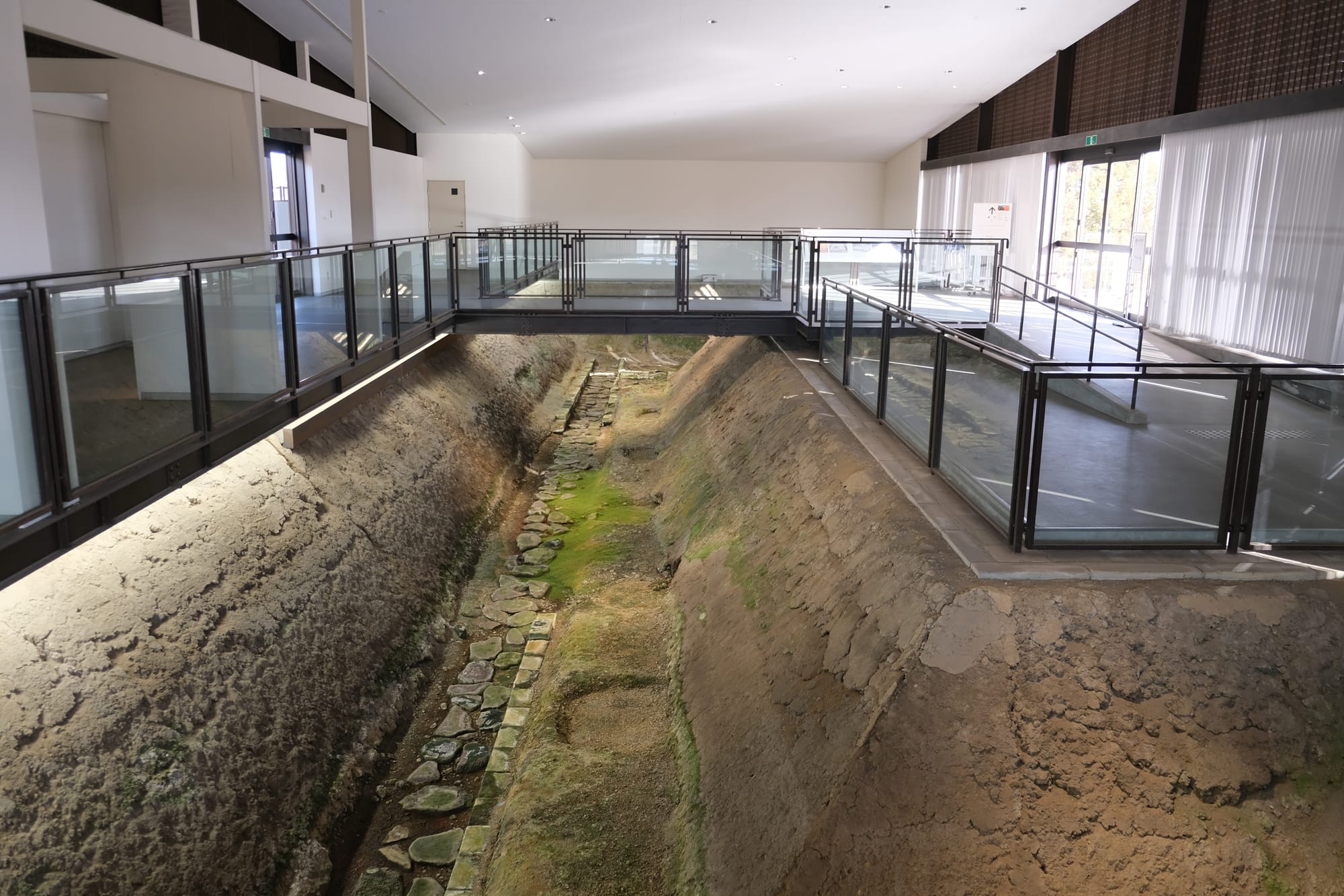 This museum building showcased some of the excavated foundations of the original palace. These holes, unearthed in the bedrock, are where the foundational posts were secured to build the palace buildings. The buildings were often rebuilt and so the holes sometimes overlapped. Archaeologists can use this information to understand how the palace evolved over time.