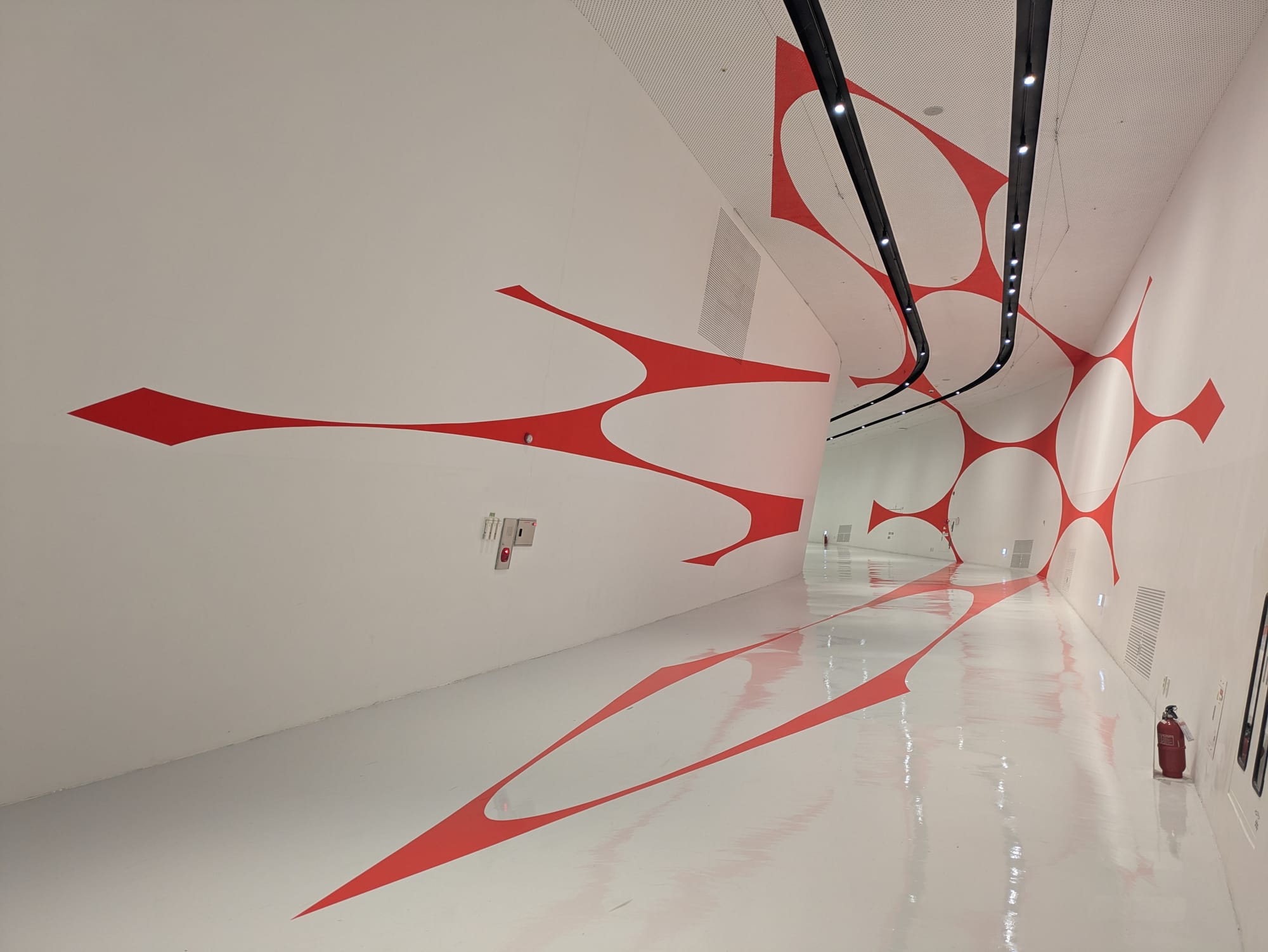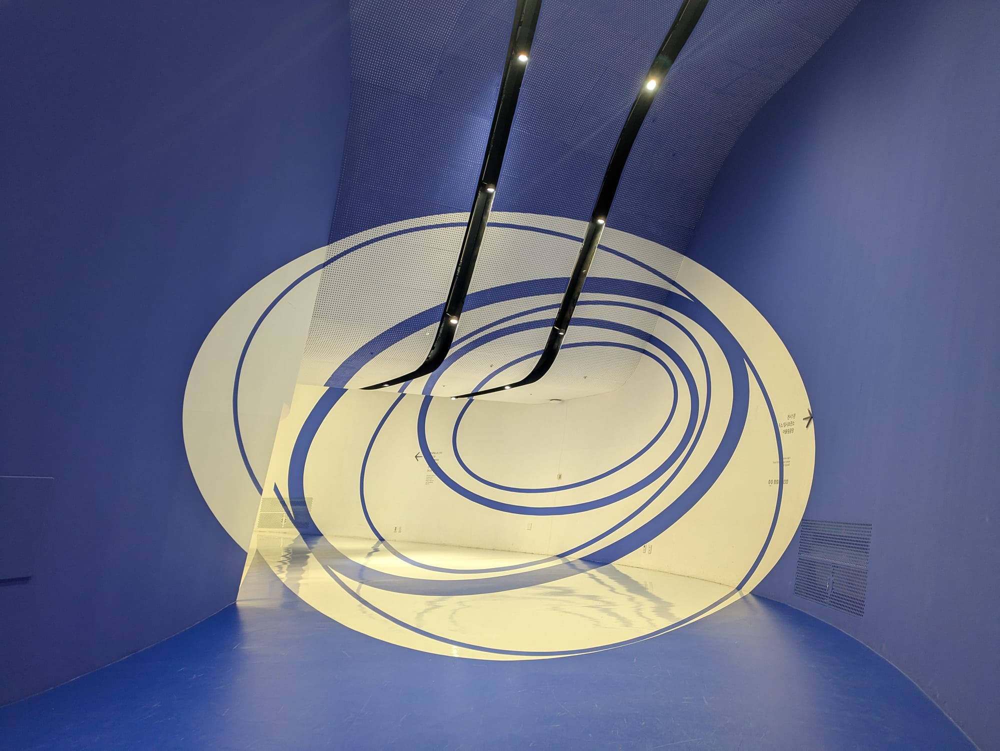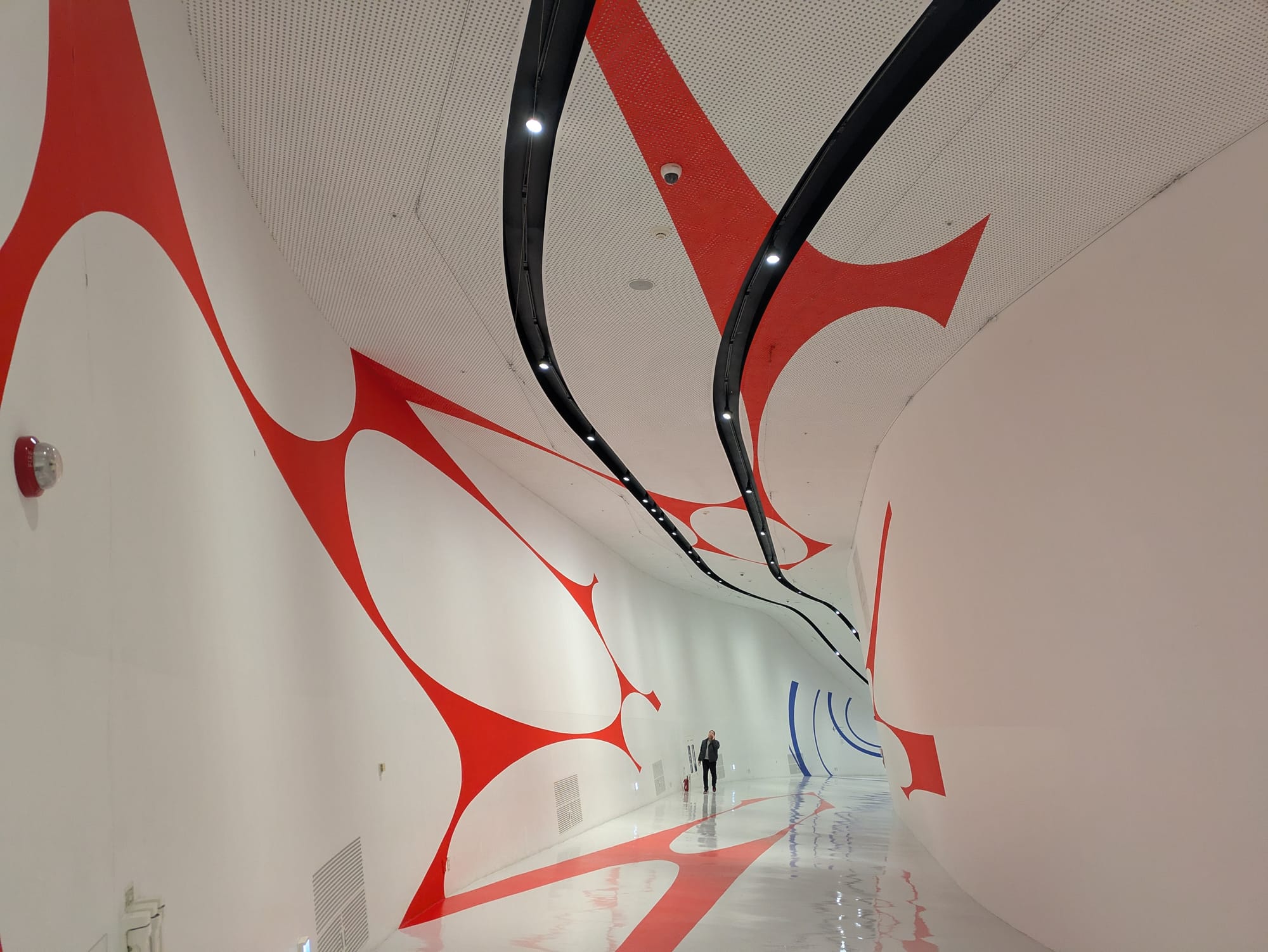 The interior of the building was no less unusual, with a central spiraling corridor that was decorated with perspective art pieces that filled the space.