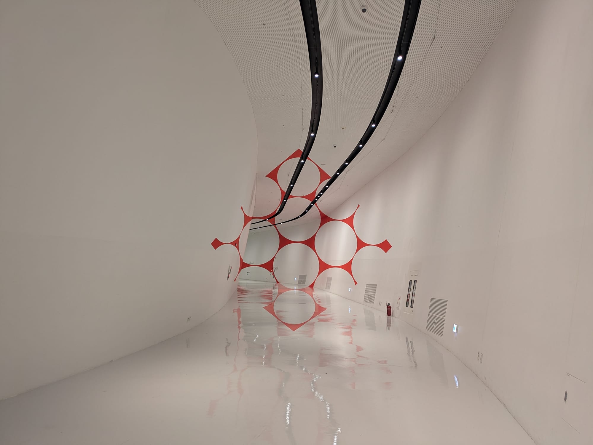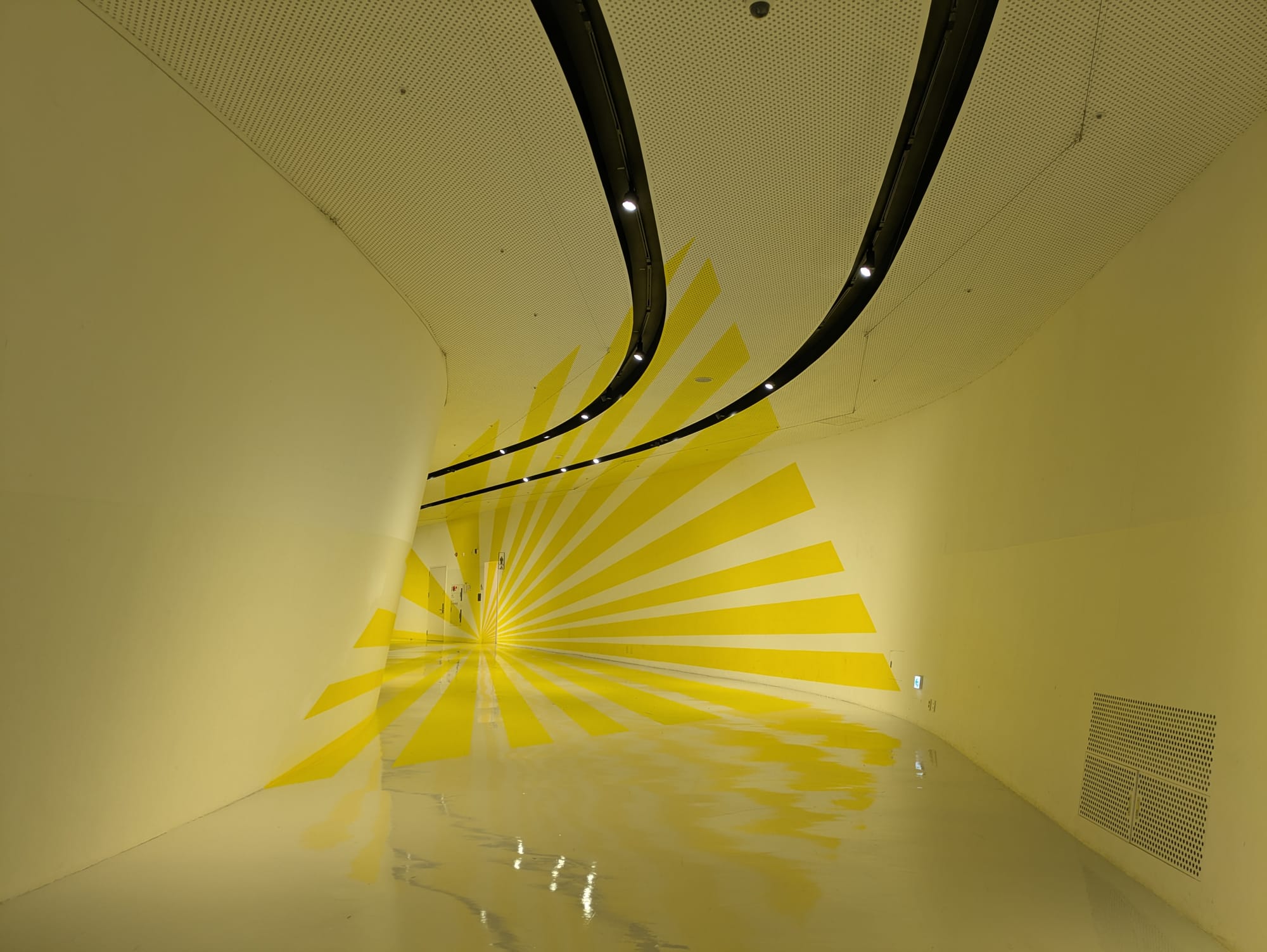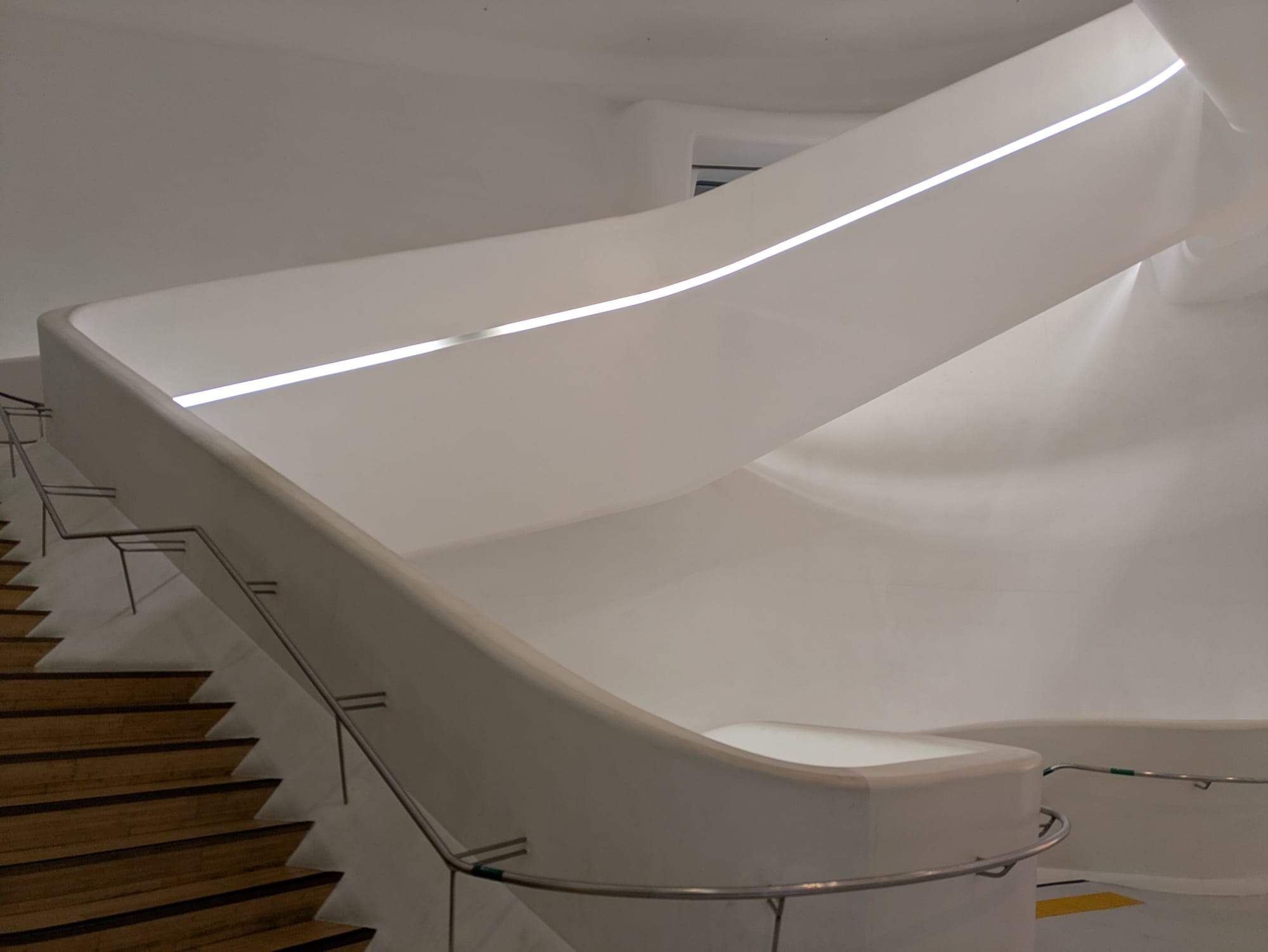 The interior of the building was no less unusual, with a central spiraling corridor that was decorated with perspective art pieces that filled the space.