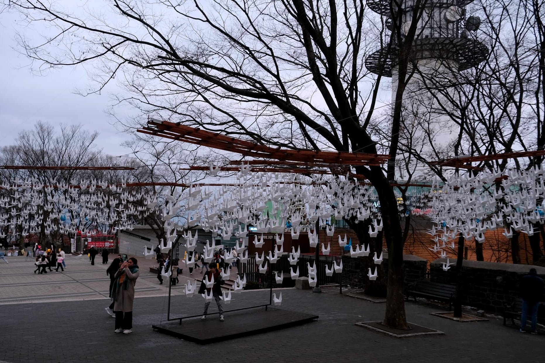 On the mountain peak, next to the tower was a display of hanging paper cranes.