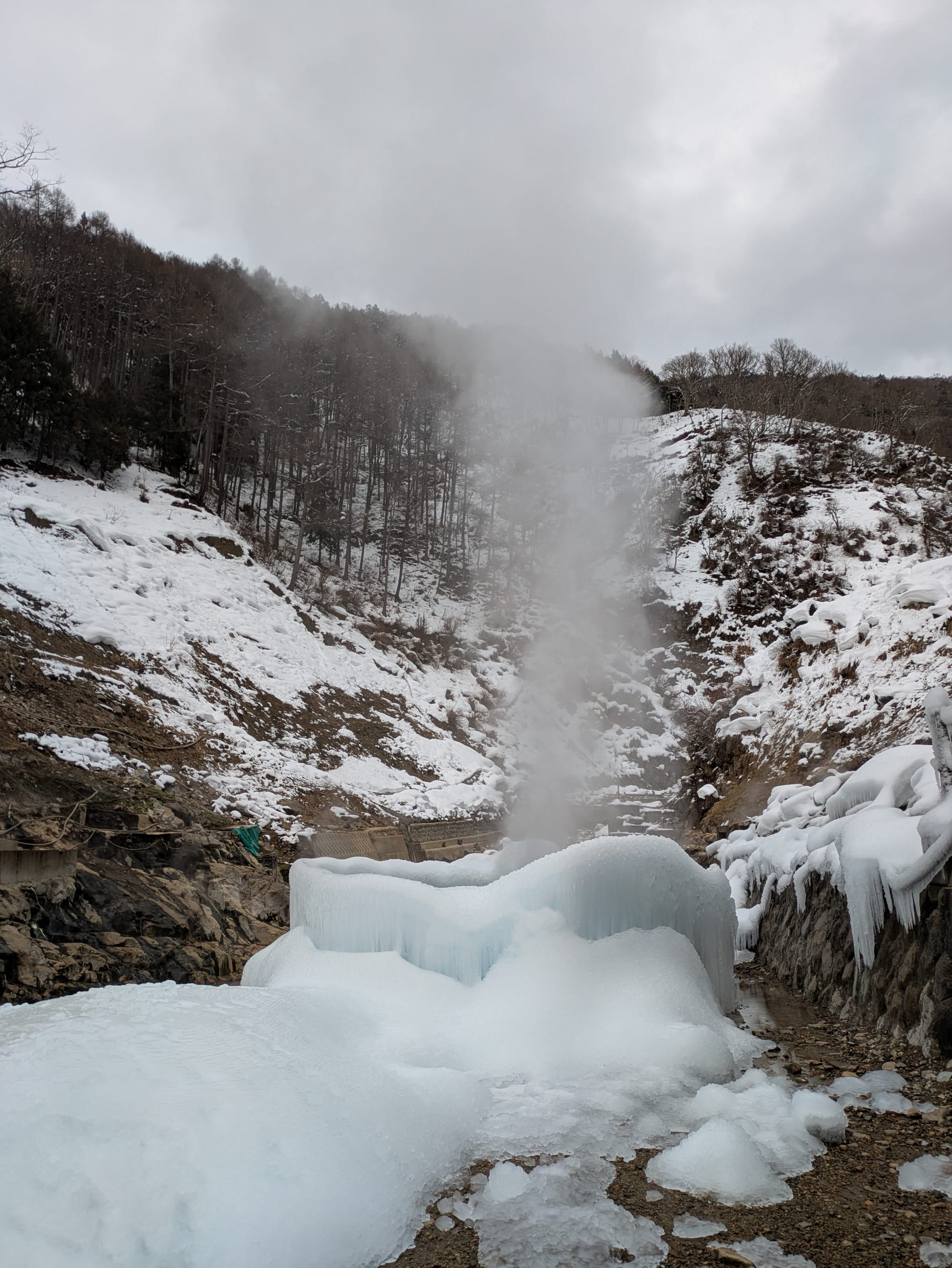 This photo is further down stream, outside the Snow Monkey Park proper. I believe this building is part of the original onsen and next to it is a vent that is continually releasing steam.