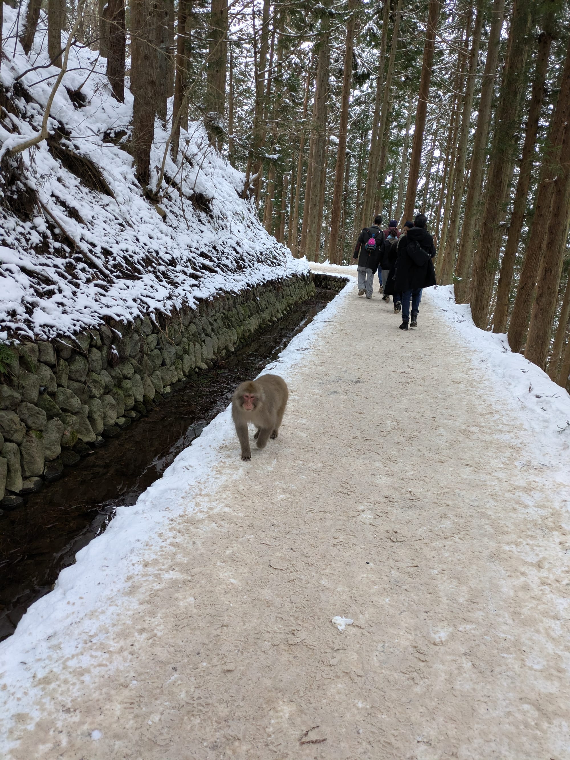 I took a shinkansen from Tokyo to Nagano and then a private train line to Yadunaka. This was properly in the mountains and here is the first time I saw snow in Japan. From Yadunaka I took a short 10 minute bus ride. From the bus stop I still had to walk about 1.5 kilometers to the actual park entrance. This was actually a beautiful walk through a mountain forest covered in snow.