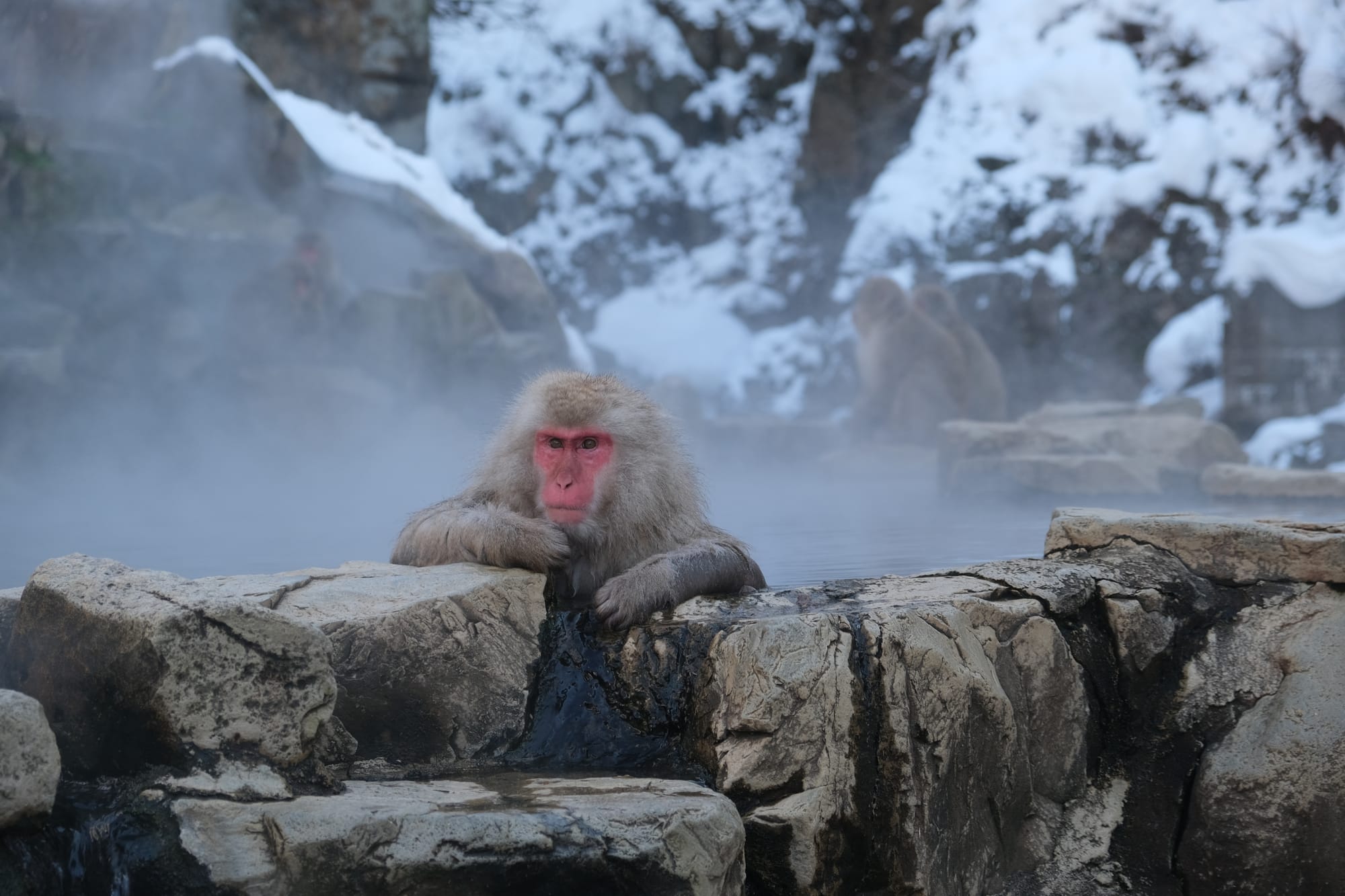 The actual park wasn't too big, located in a valley, with steep slopes on all sides it provided a protected environment for the monkeys to shelter in during winter. The centre piece of the park is a hot spring bathing pool built for the monkeys. The story goes that the monkeys kept invading the local onsen (thermal spring baths) built for humans so the owners built one just for the monkeys. During winter the monkeys come to the park and bathe in the hot spring, and apparently this is the only place in the world where wild monkeys do this.