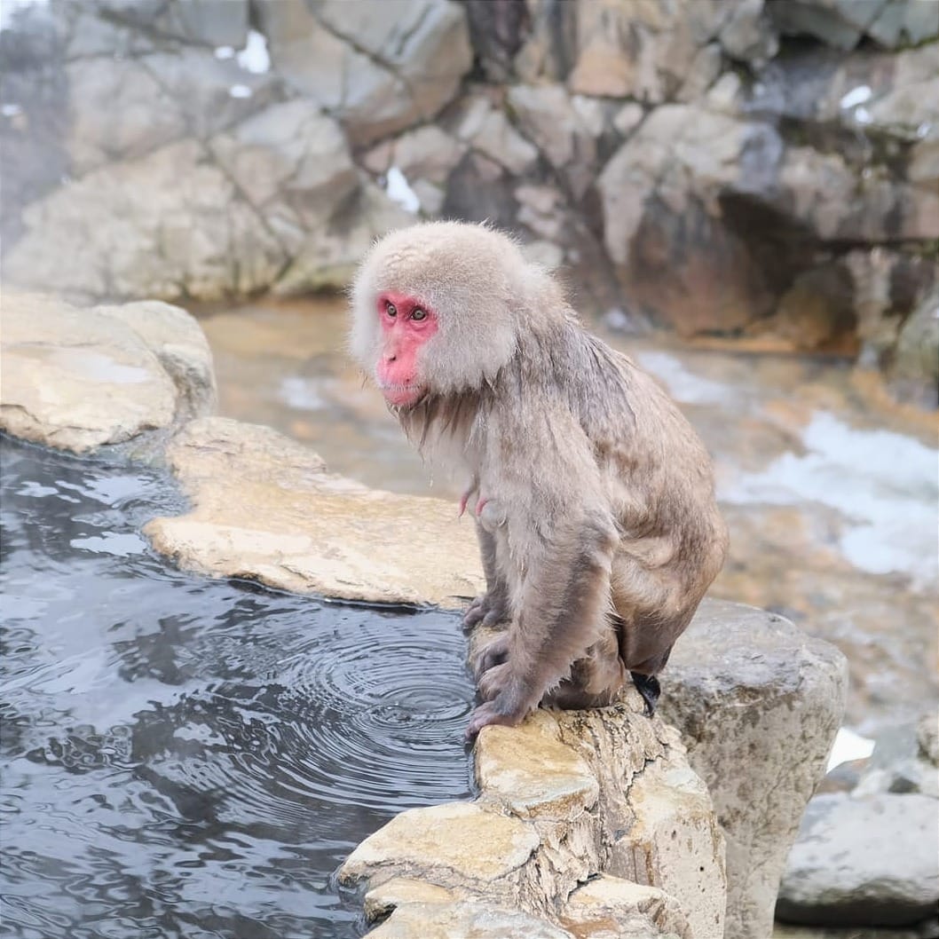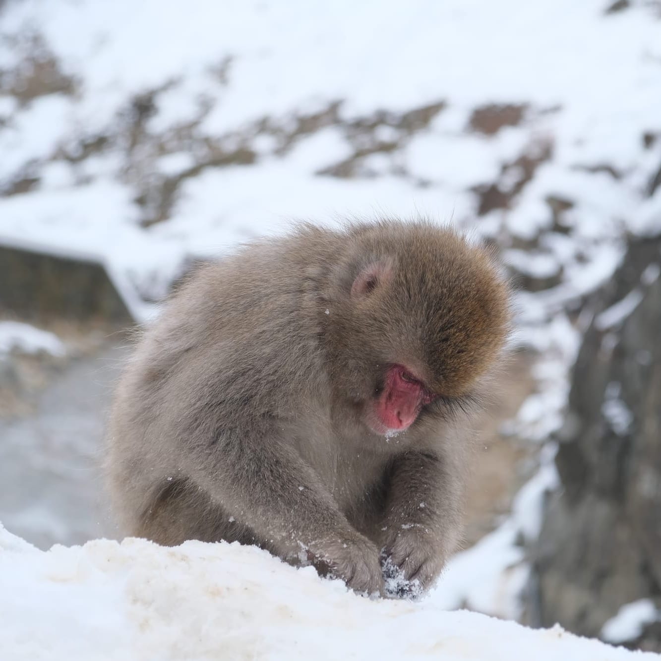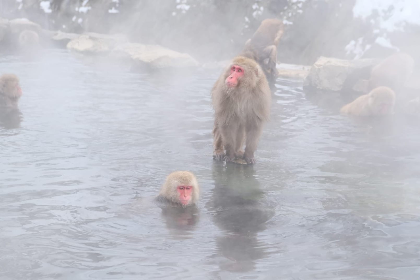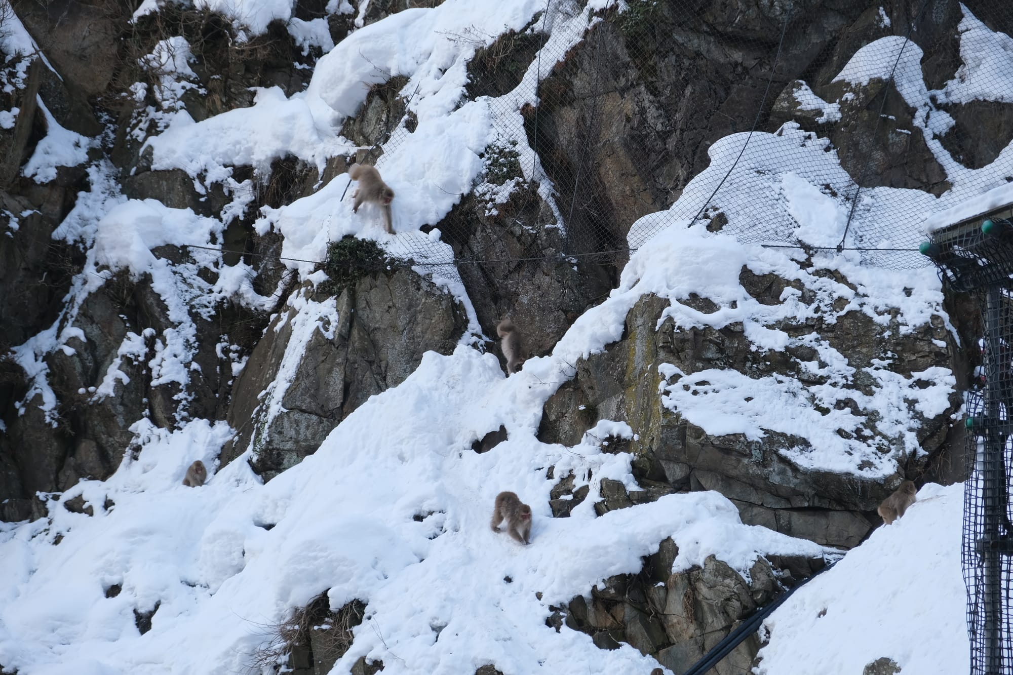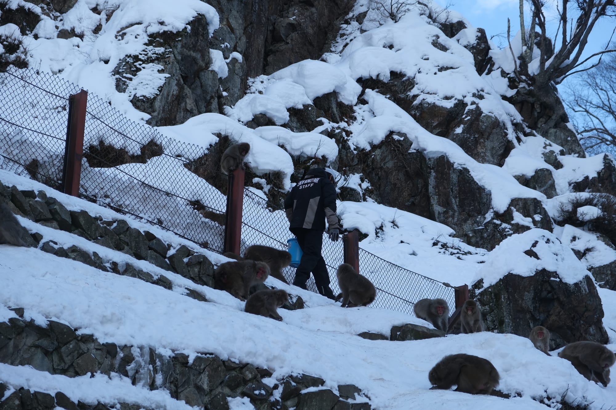 I had arrived at the park around lunch time and I spent most of the afternoon observing the monkeys, taking plenty of pictures. Previously, I have been a little afraid of monkeys when I saw them in other parts of Asia. I know they are smart and clever and can be aggressive, I have seen many signs telling tourists "beware of monkeys". Here though the monkeys were fairly chill and I felt safe observing them with the crowd. I was always careful when approaching them to take pictures, never actually leaving the designated paths. The only times a monkey actually brushed up against me was when they were trying to get from one place to another and I just happened to be standing nearby. Many of them were very cute, especially the younger ones with their huge fluffy coat of fur. Most spent their time looking for the food provided by the park staff, some though were grooming each other, some fought with each other on occasion, and of course, a few relaxed in the hot spring.