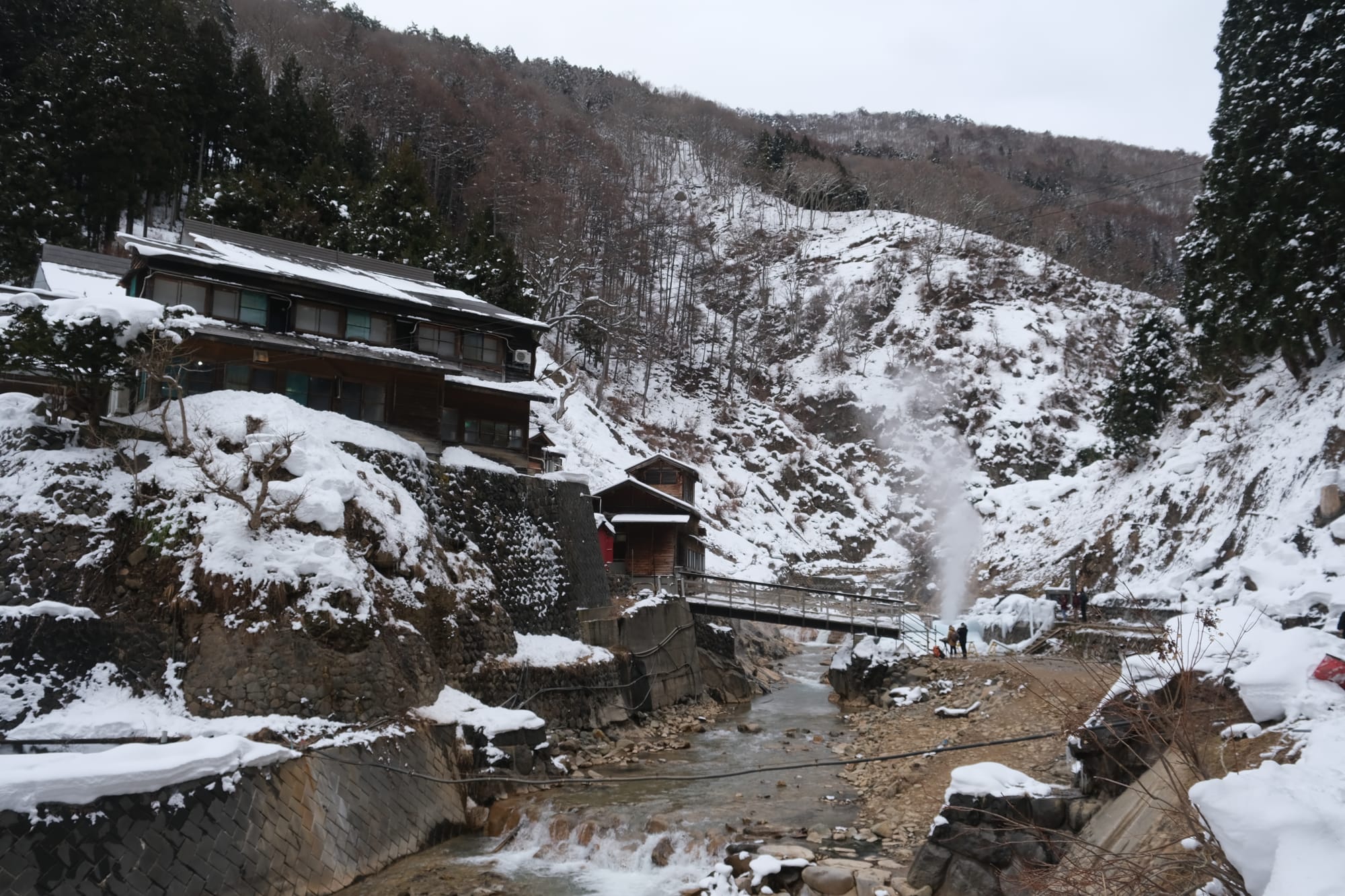 This photo is further down stream, outside the Snow Monkey Park proper. I believe this building is part of the original onsen and next to it is a vent that is continually releasing steam.