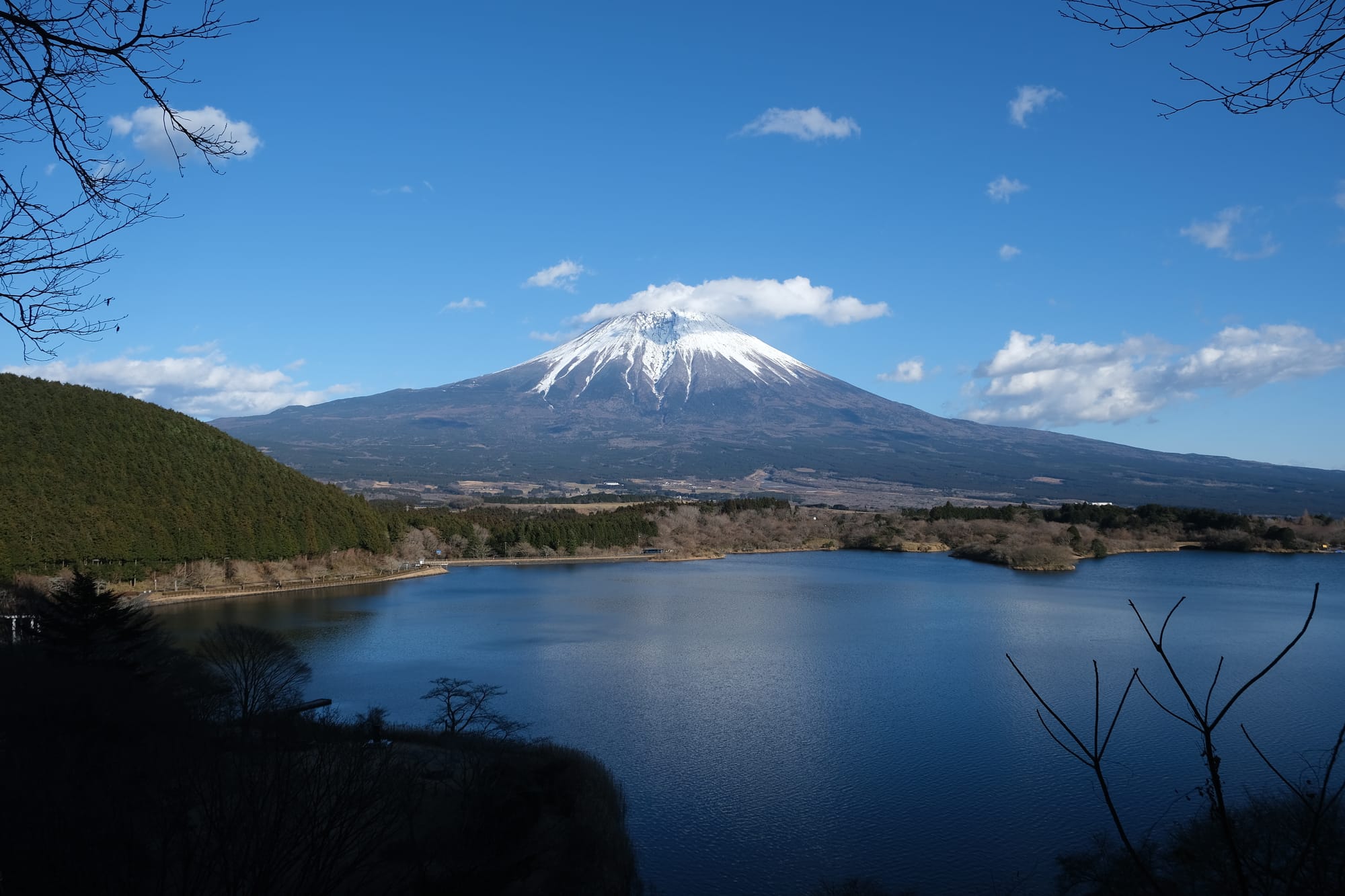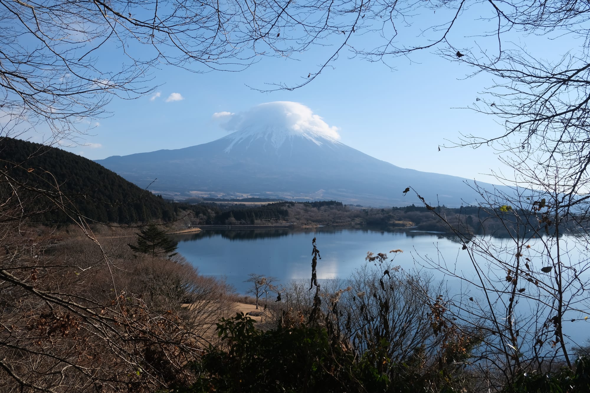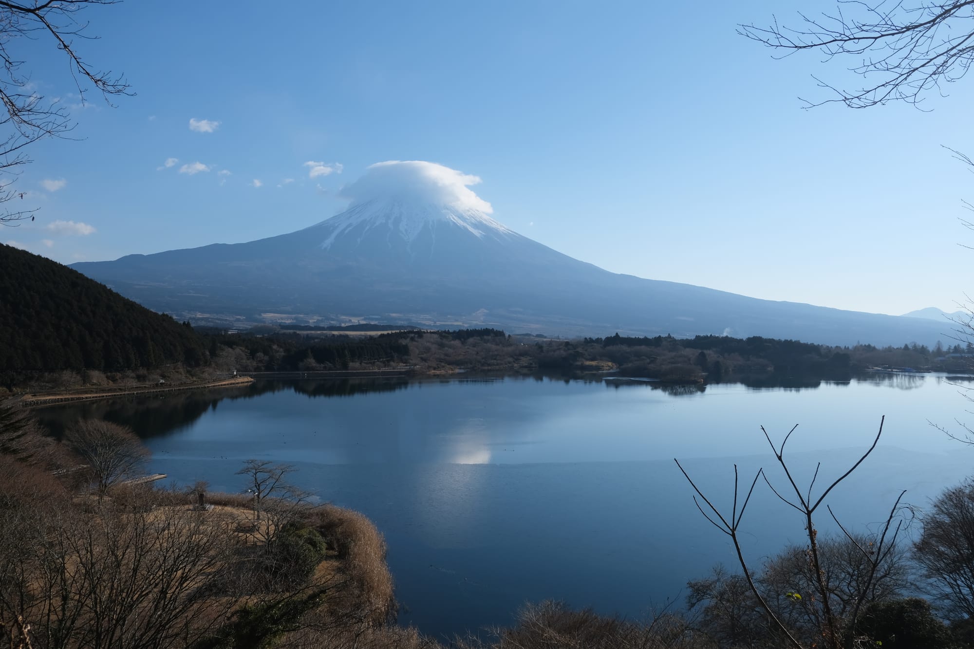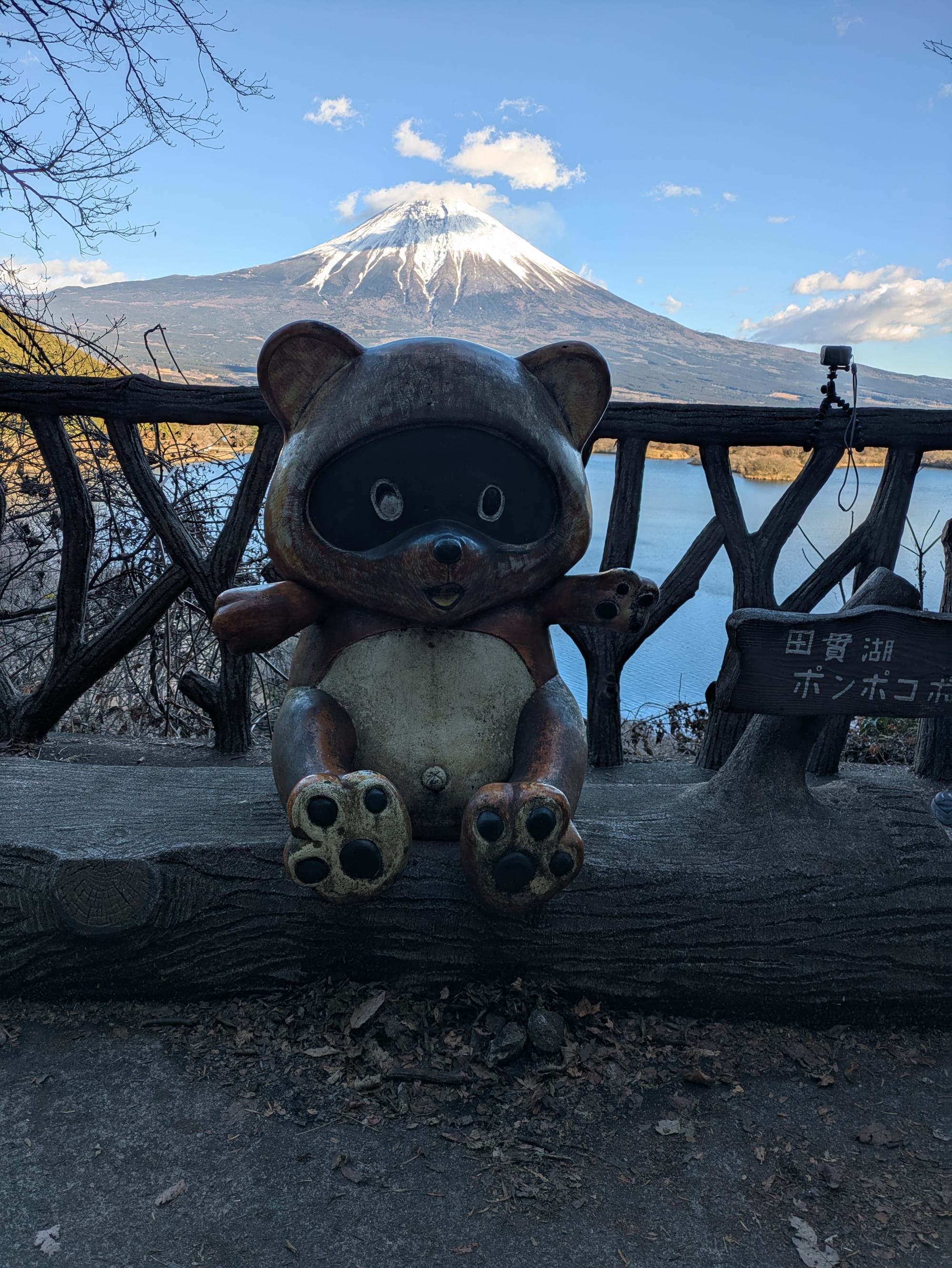On our way from Kyoto to Tokyo, my brother and I wanted get a good look at Mount Fuji. We knew we couldn't climb Fuji in the winter so instead we wanted to go somewhere with a good view of the mountain. We stopped at the Shin-Fuji Shinkansen station, located to the south of the mountain, near the coast. From that station, we could already see the mountain, but we wanted an even better view. I had spent some time before, researching different look-out locations, and eventually I found the best option was at Lake Tanuki.