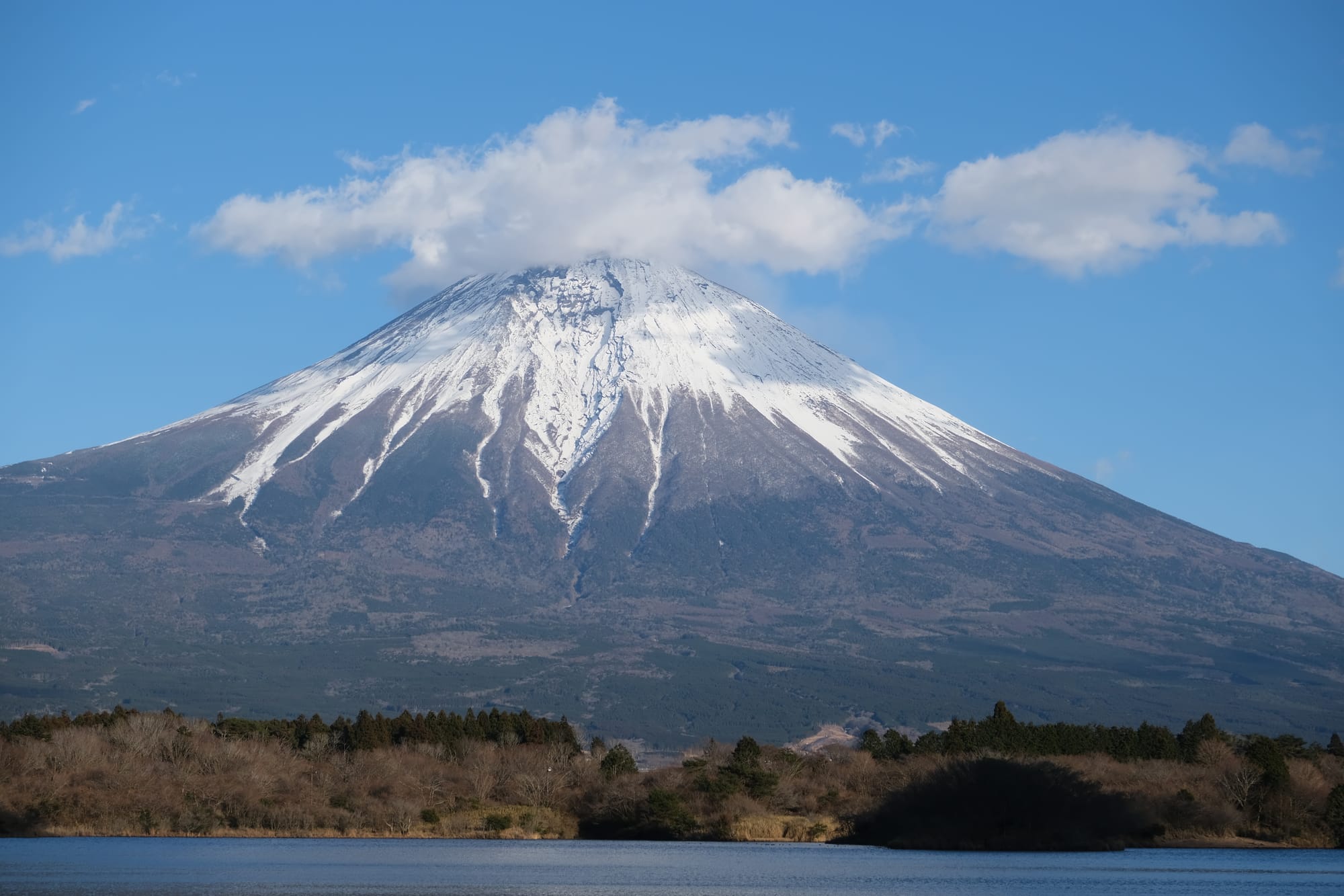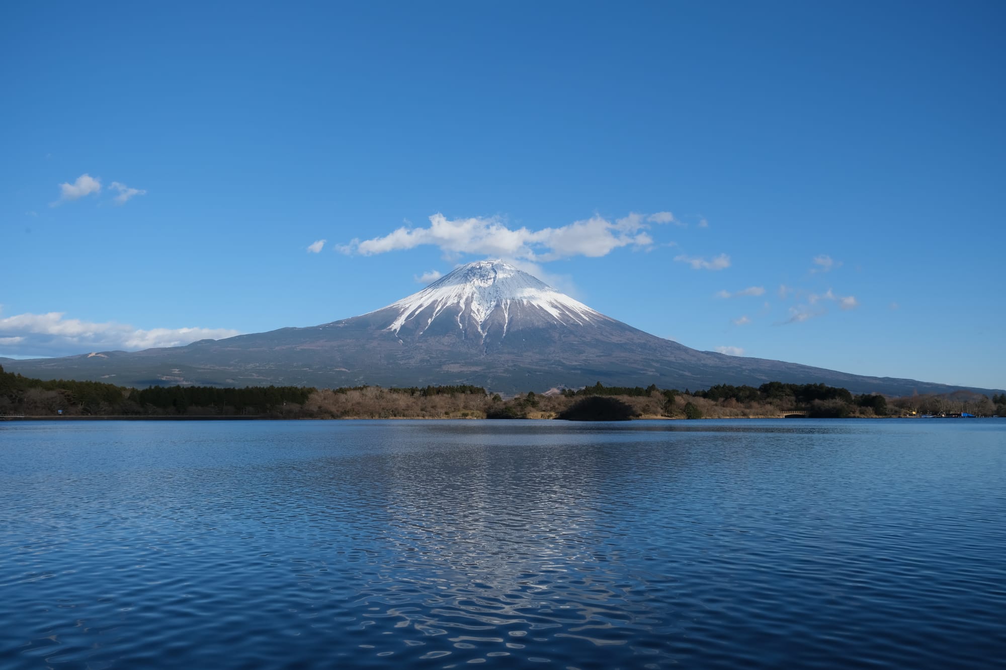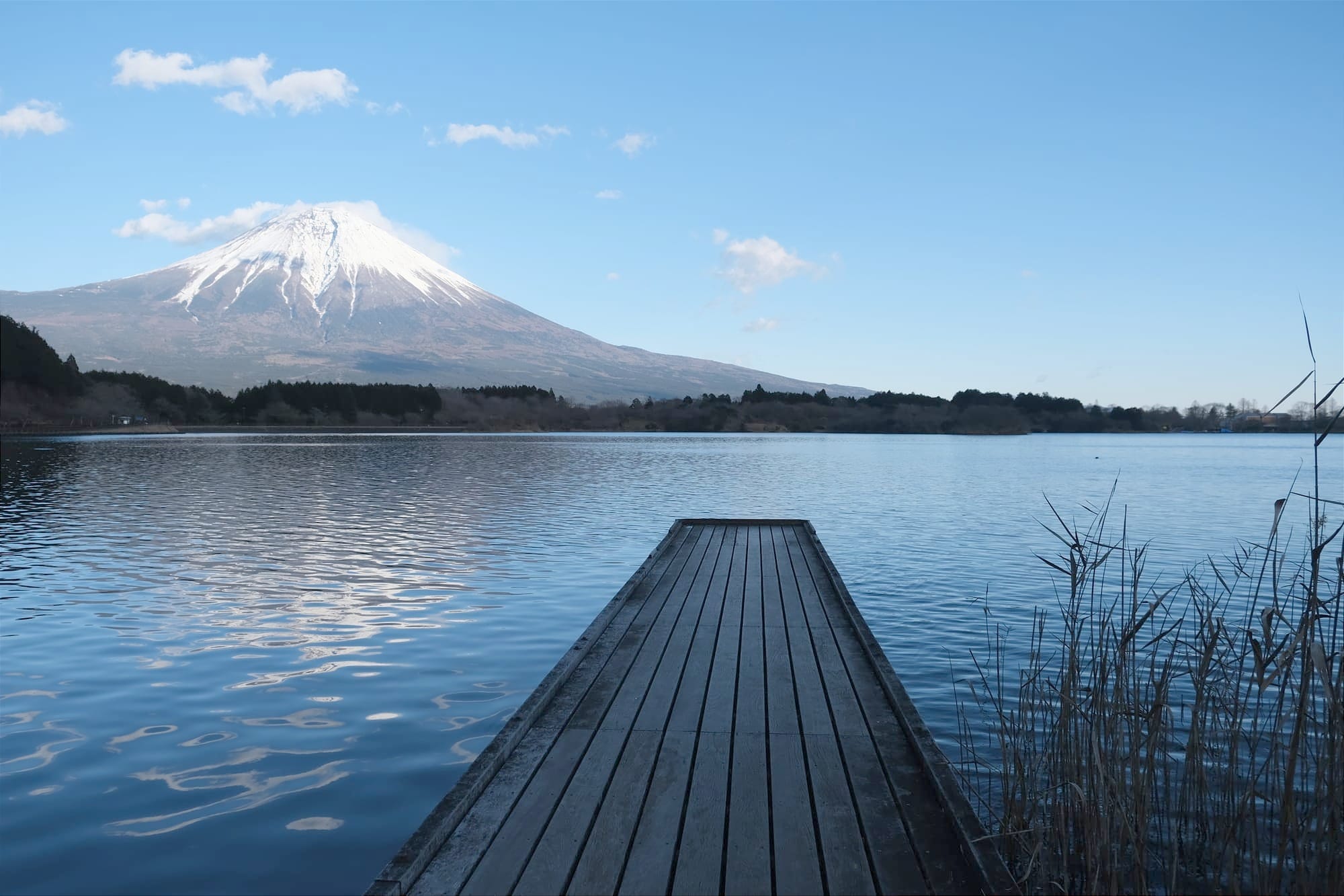 Mount Fuji as seen from the lakeshore.