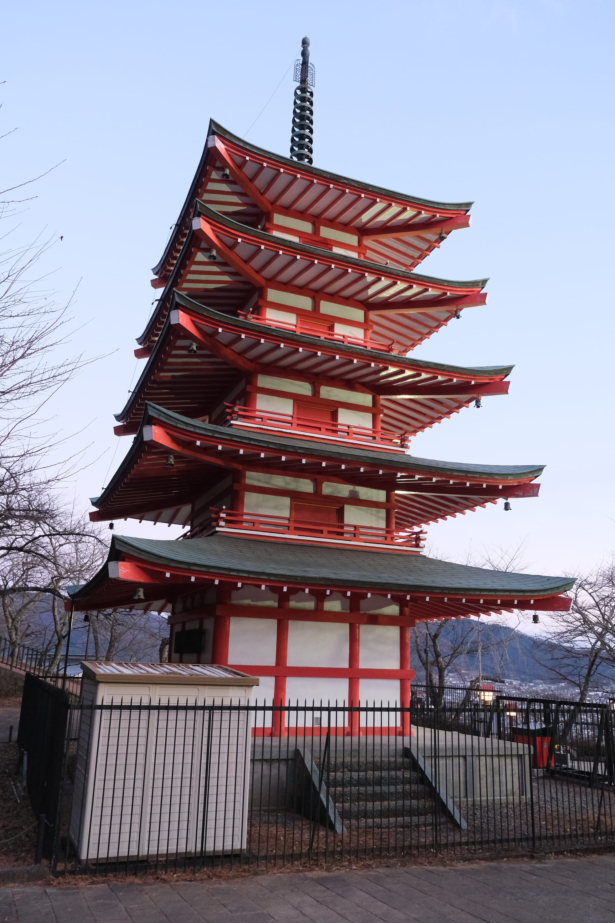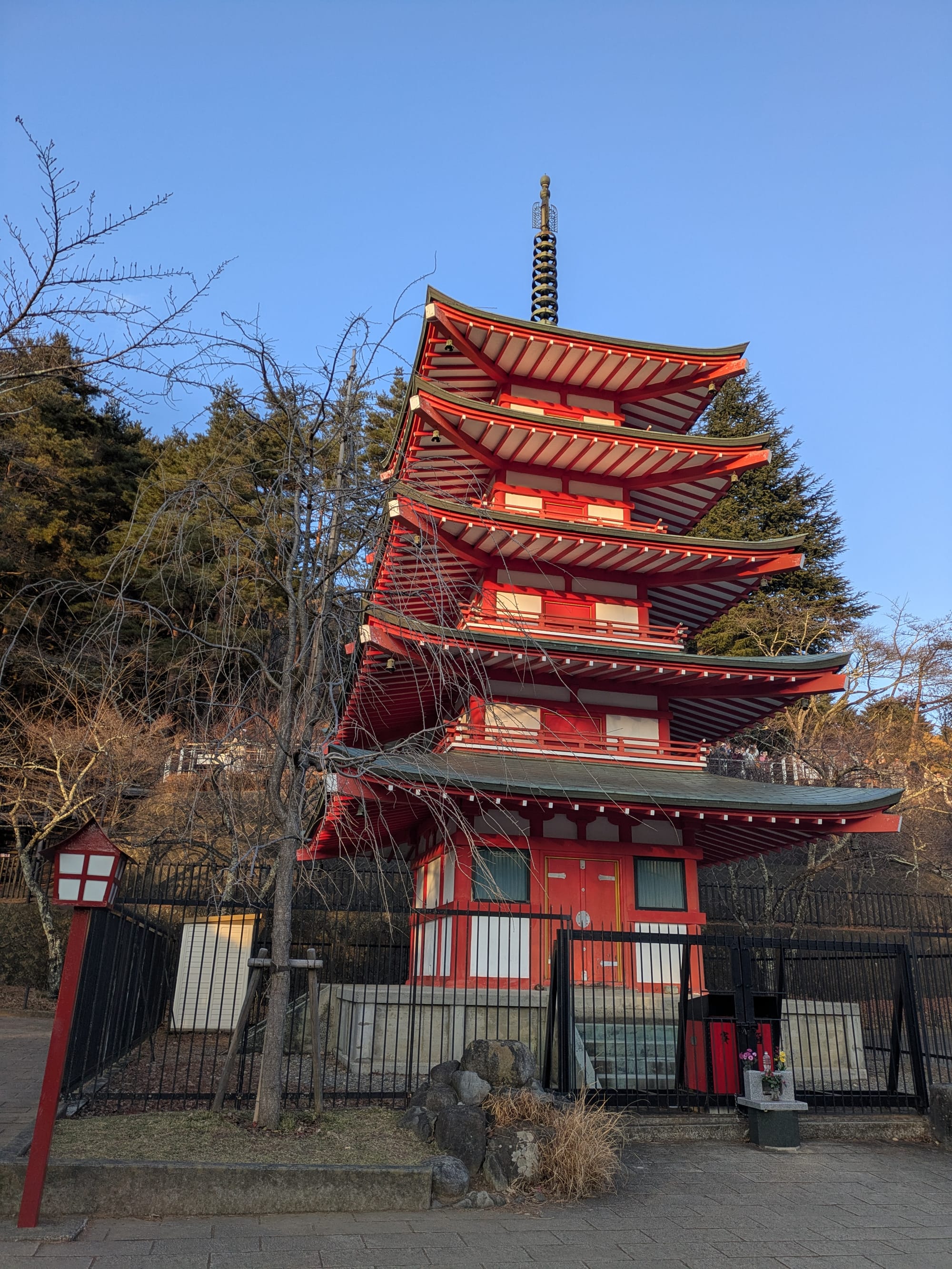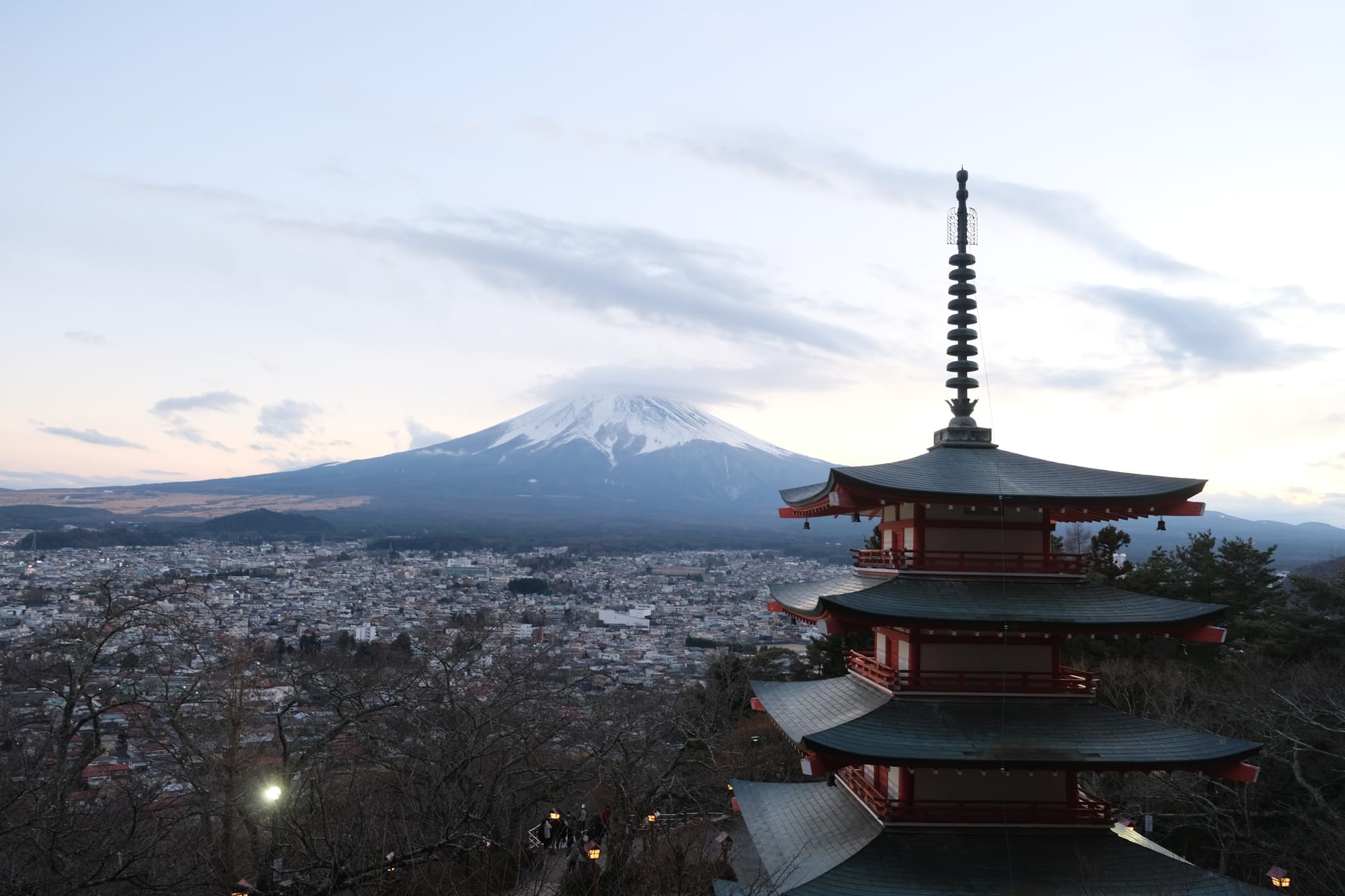 I arrived at the Chureito pagoda in the late afternoon. The observation deck faced south-west towards Mount Fuji and the setting sun. Only the side of the pagoda in shadow was readily visible from the observation deck. This meant that capturing photos with both the pagoda and Mount Fuji was difficult as the pagoda was dark, back-lit almost like a silhouette, while the mountain was still brightly lit by the sun. I figured out the best lighting would be the moment after sunset when the light level between Fuji and the pagoda would align. So I found a good spot to wait out the sun, setting up a time lapse of the mountain while I waited.