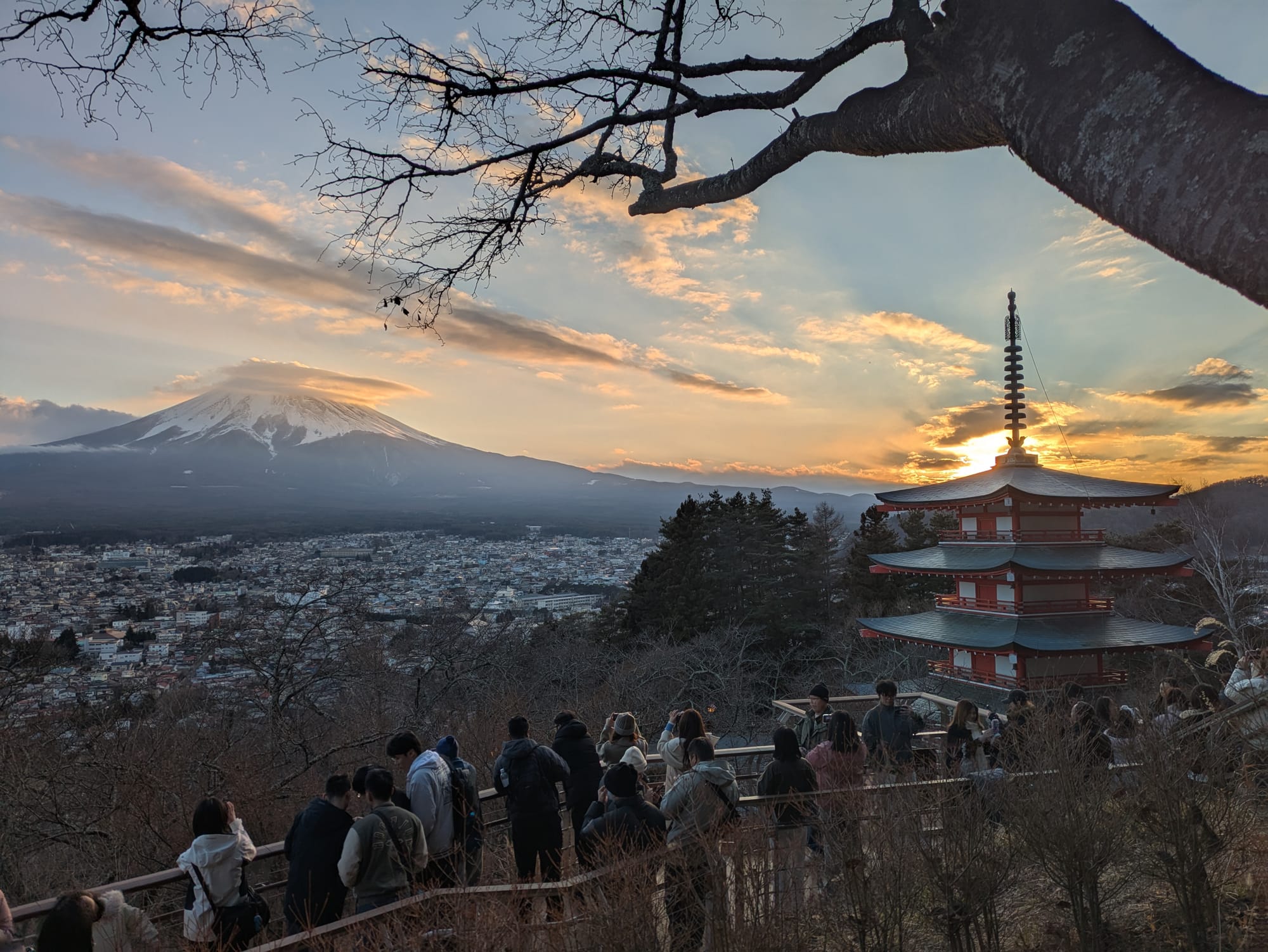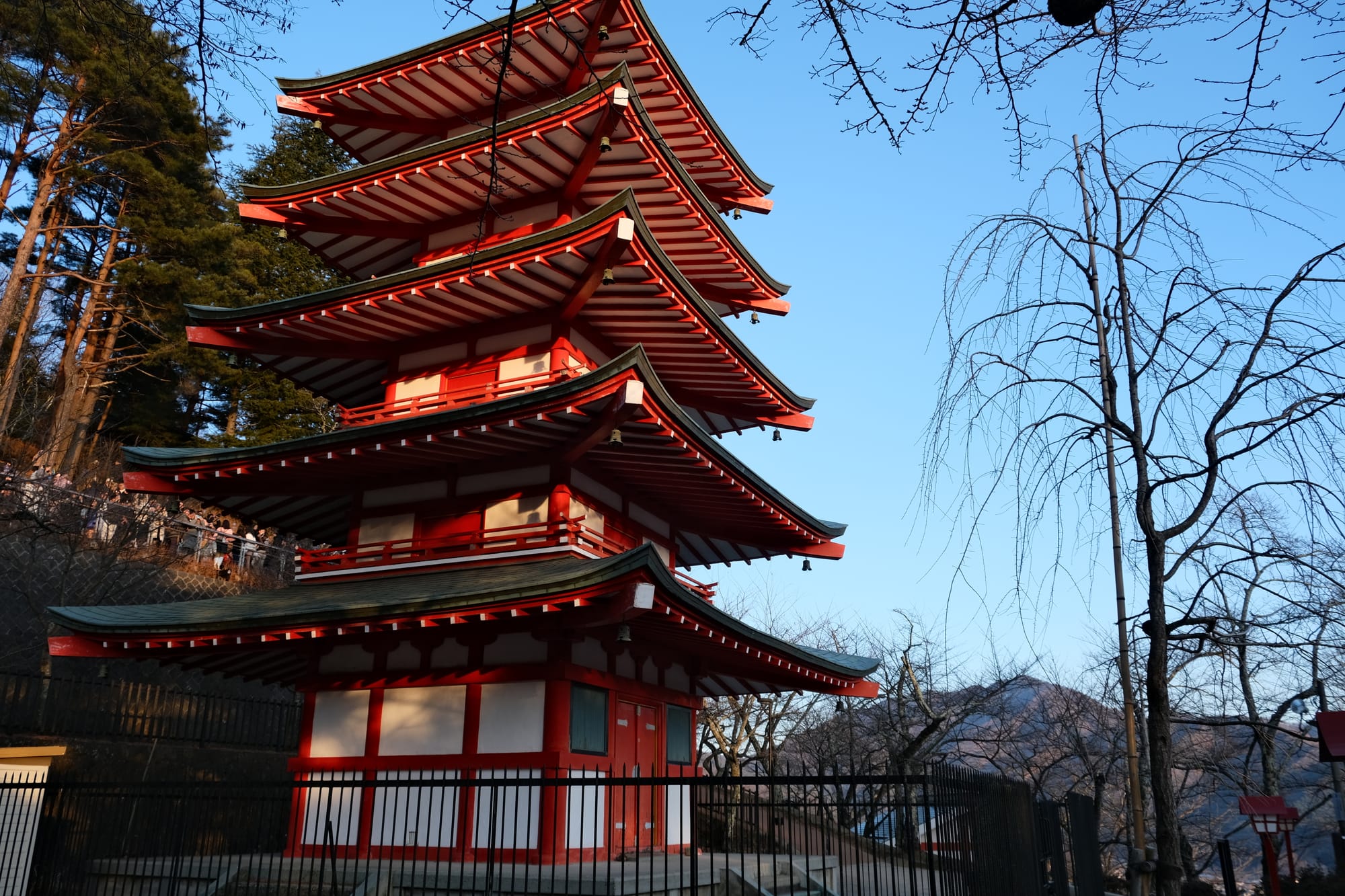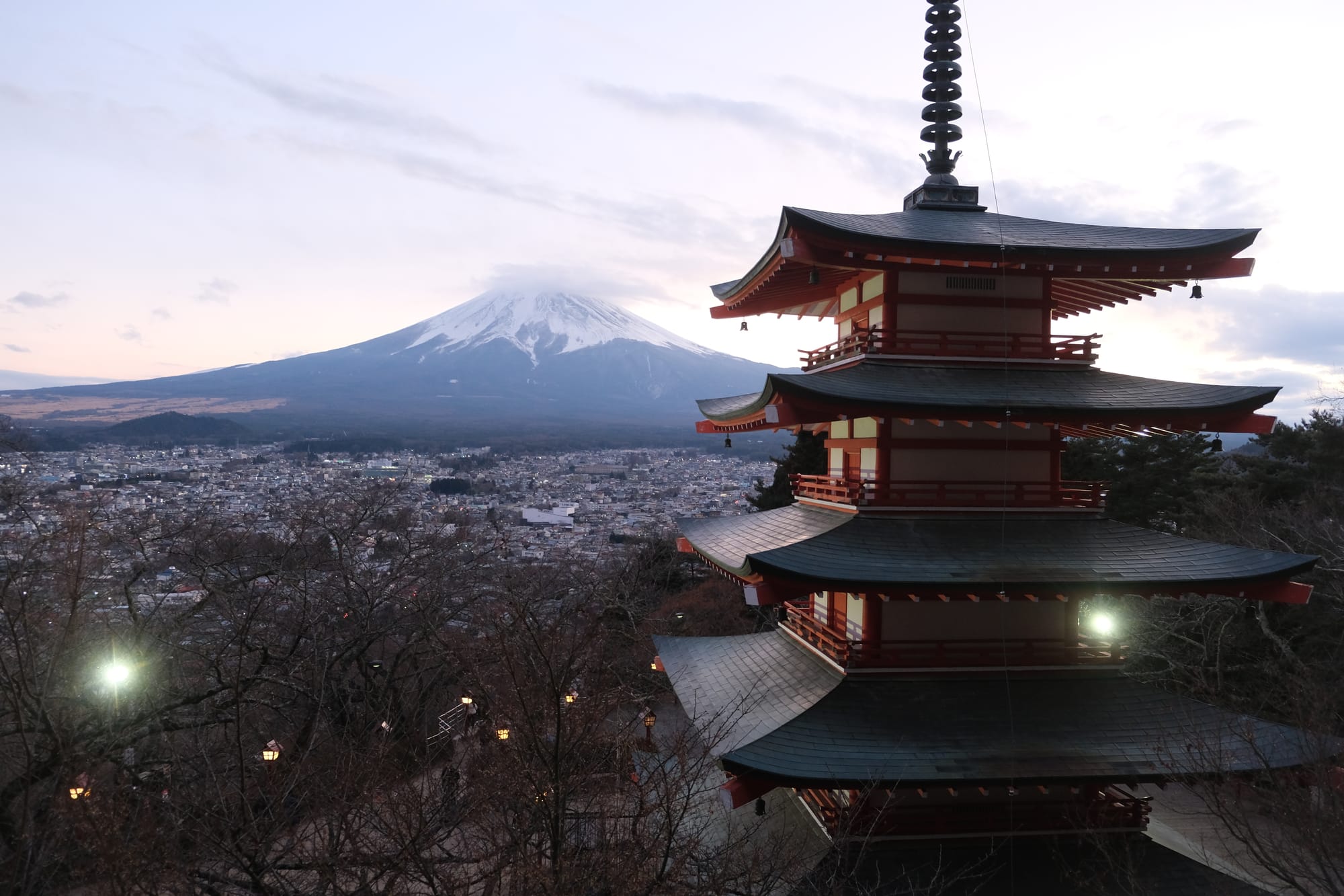 I arrived at the Chureito pagoda in the late afternoon. The observation deck faced south-west towards Mount Fuji and the setting sun. Only the side of the pagoda in shadow was readily visible from the observation deck. This meant that capturing photos with both the pagoda and Mount Fuji was difficult as the pagoda was dark, back-lit almost like a silhouette, while the mountain was still brightly lit by the sun. I figured out the best lighting would be the moment after sunset when the light level between Fuji and the pagoda would align. So I found a good spot to wait out the sun, setting up a time lapse of the mountain while I waited.